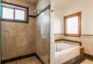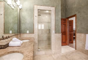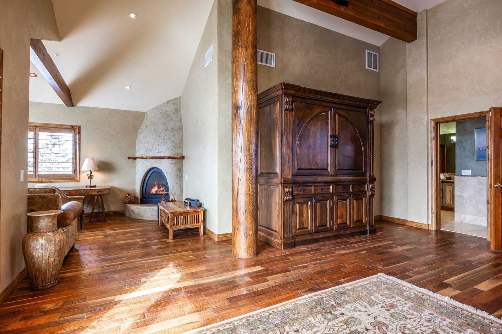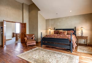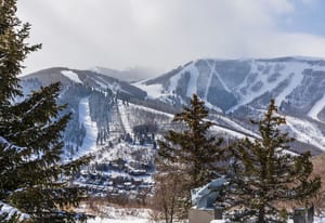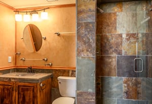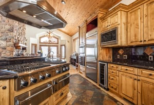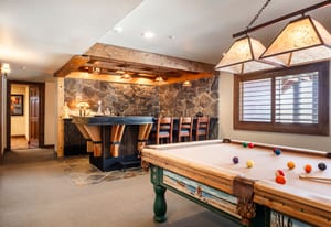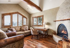 The massive primary suite is a private retreat, complete with its own sitting room, fireplace, jetted tub, steam shower, expansive walk-in closet room, and an oversized terrace perfectly oriented to capture sweeping mountain vistas. A second primary suite offers a walk-in closet, soaker tub, forest views, and private terrace access.