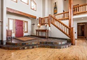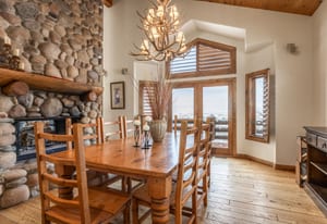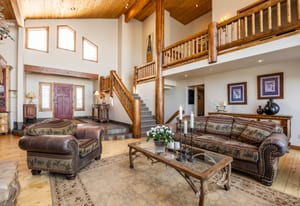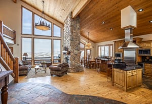 Spanning 5,847 square feet, the thoughtfully designed six-bedroom, five-bath residence features an intelligent floor plan that balances grandeur with warmth. Soaring two-story windows flood the home with natural light, while a dramatic double-sided stone fireplace anchors the open-concept living spaces. The chef’s kitchen flows seamlessly into fireside dining — perfect for gathering and entertaining against a backdrop of unforgettable views.