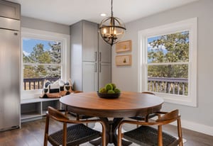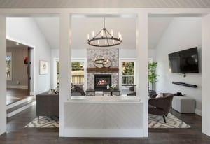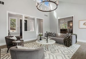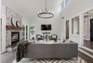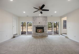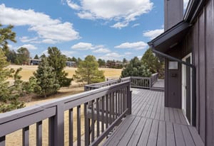 Step inside to a light-filled living room anchored by a cozy gas fireplace, framed by two sliding glass doors that open to the expansive wraparound deck—creating effortless indoor-outdoor living and front-row seats to the golf course backdrop.