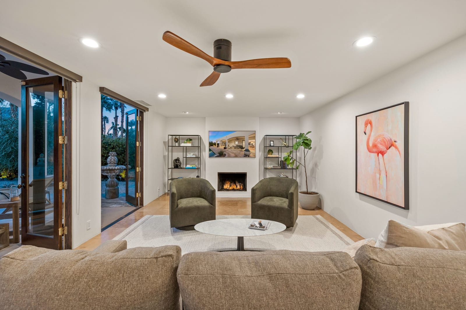 The thoughtfully designed floor plan flows seamlessly throughout. The living room features a cozy fireplace and French doors that open to a large covered patio with direct access to the pool and spa--creating effortless indoor-outdoor living.