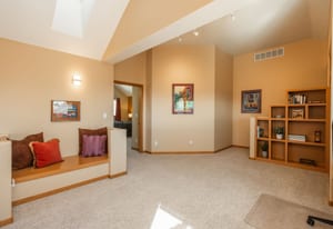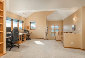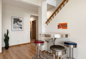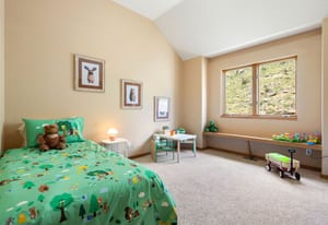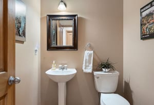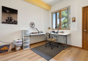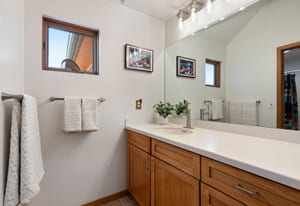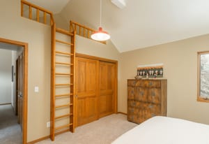 Upstairs, an airy loft with built-in bookshelves, desktop, and reading nooks provides flexible family space. The spacious primary suite showcases vaulted ceilings, breathtaking Mt. Blue Sky views, and a newly updated bathroom. Two additional bedrooms and a full bath complete the upper level.