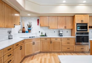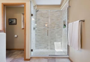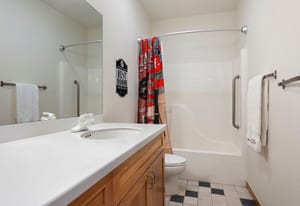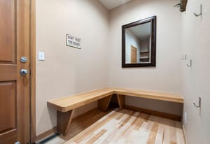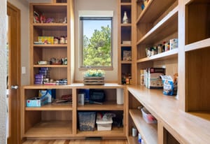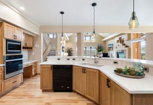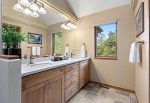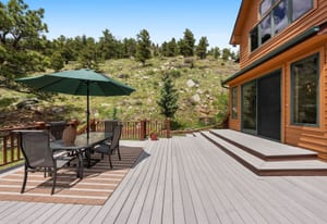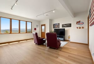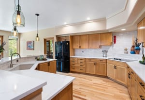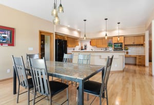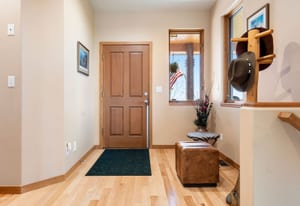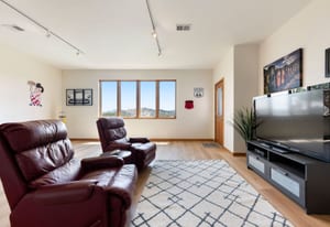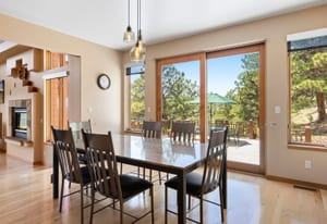 Step inside to a contemporary open design featuring light hickory hardwood flooring and a great room with dramatic floor-to-ceiling windows overlooking rolling hills of pine and aspen. The great room flows into a welcoming dining area with a perfectly framed vista of Mt. Blue Sky. A massive deck extends the living space outdoors, creating an ideal setting for gatherings both formal and informal. The kitchen continues the casually elegant aesthetic with quartz countertops, subway tile backsplash, and warm hickory cabinetry, while a classic walk-in pantry and convenient main-floor laundry add everyday practicality.