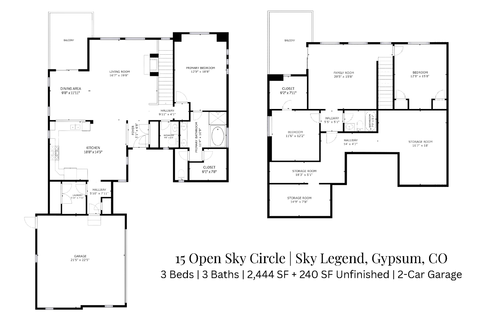 Sky Legend's 15 Open Sky Circle offers sweeping, unobstructed views over Gypsum Creek Golf Course, up-valley to New York Mountain, and beyond. Ideally positioned on the eastern edge of Sky Legend, this property enjoys protected sight lines that will remain expansive forever. This 3-bedroom, 3-bath home pairs comfort with smart efficiency. The solar system virtually eliminates electric bills and offsets the cost of air conditioning during Gypsum's warm summer months. The kitchen has been thoughtfully updated with new quartz countertops, stainless steel appliances, and freshly refinished solid wood cabinetry. Engineered white oak flooring spans most of the main level, creating a warm and cohesive living space. Designed for ease, the main-level primary suite allows for true single-level living, with oversized windows that frame the same dramatic views enjoyed from the great room. Step out onto the back deck to take in sunrise over the golf course with morning coffee or unwind with dinner against a backdrop of alpenglow. The lower level offers a generous secondary living area, two spacious bedrooms, and access to an additional deck. An unfinished, rough-plumbed space presents the opportunity for a fourth bedroom with an en-suite bath or can remain flexible for storage, fitness, or hobbies. This extra space paired with the two-car garage provide ample room for all your gear and seasonal items. 15 Open Sky Circle is a rare opportunity for main level living with huge views, energy efficiency all within the vibrant and desirable Cotton Ranch community.