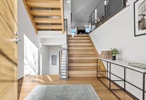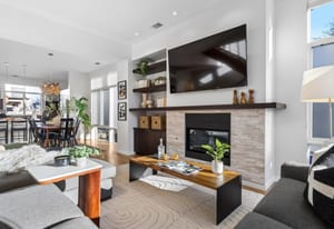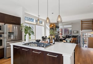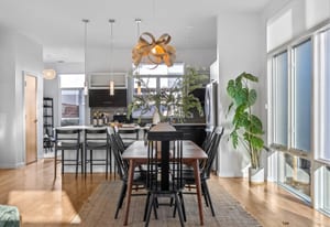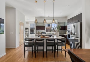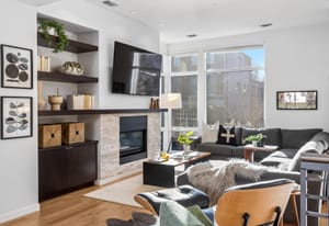 Inside, expansive ceilings and sun-filled interiors create an airy, modern atmosphere across approximately 2,500 square feet of living space. The open-concept main level is designed for effortless entertaining, featuring a spacious living and dining area anchored by a designer kitchen with premium finishes and sleek cabinetry. South-facing windows flood the home with natural light, enhancing the warm, contemporary aesthetic throughout.