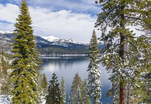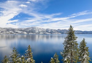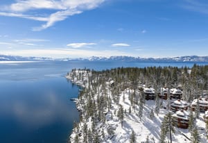 At the highest point within Stillwater Cove, Residence #24 commands elevated waterfront views across the northern edge of Lake Tahoe, framing Incline Village and Diamond Peak in the distance. From this vantage, the marina and shoreline sit below while mountain ridgelines rise beyond, creating a layered perspective that feels private and composed.