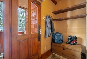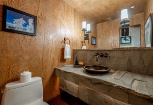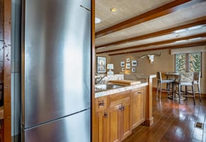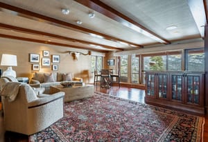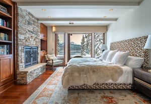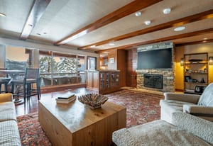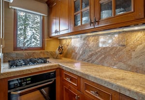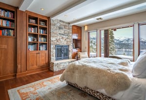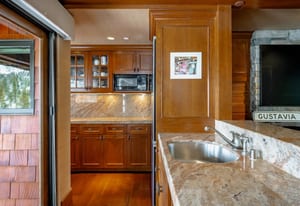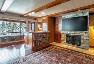 The main living area is anchored by a wood-burning fireplace and wrapped in rich Tahoe textures. Dark wood floors, warm tones, grass cloth walls, granite countertops, and custom built-ins give the home depth and presence. Subtle architectural detail in the ironwork reinforces the alpine aesthetic without competing with the view.