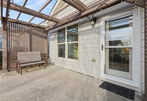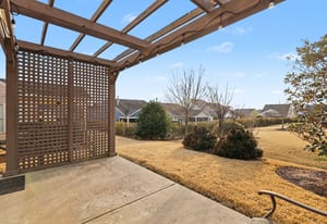 Outdoor Oasis: Step out to your private backyard retreat featuring a pergola-covered patio with a custom privacy screen—ideal for year-round NC outdoor living.