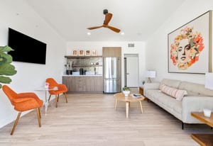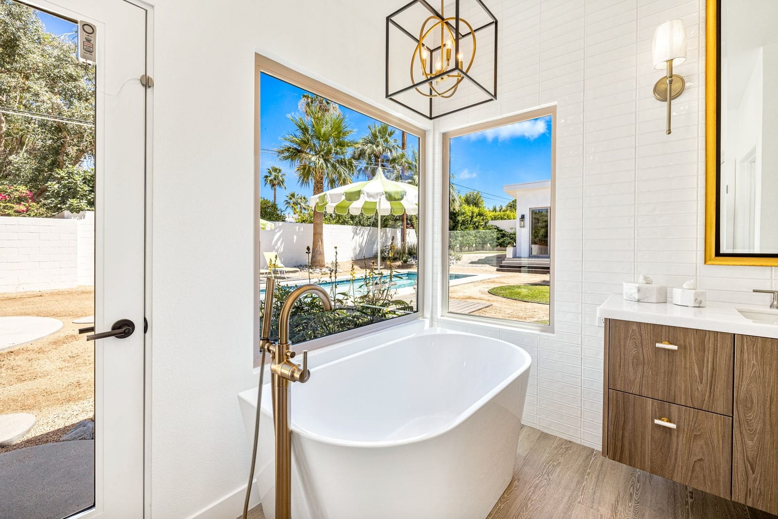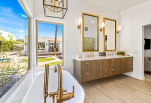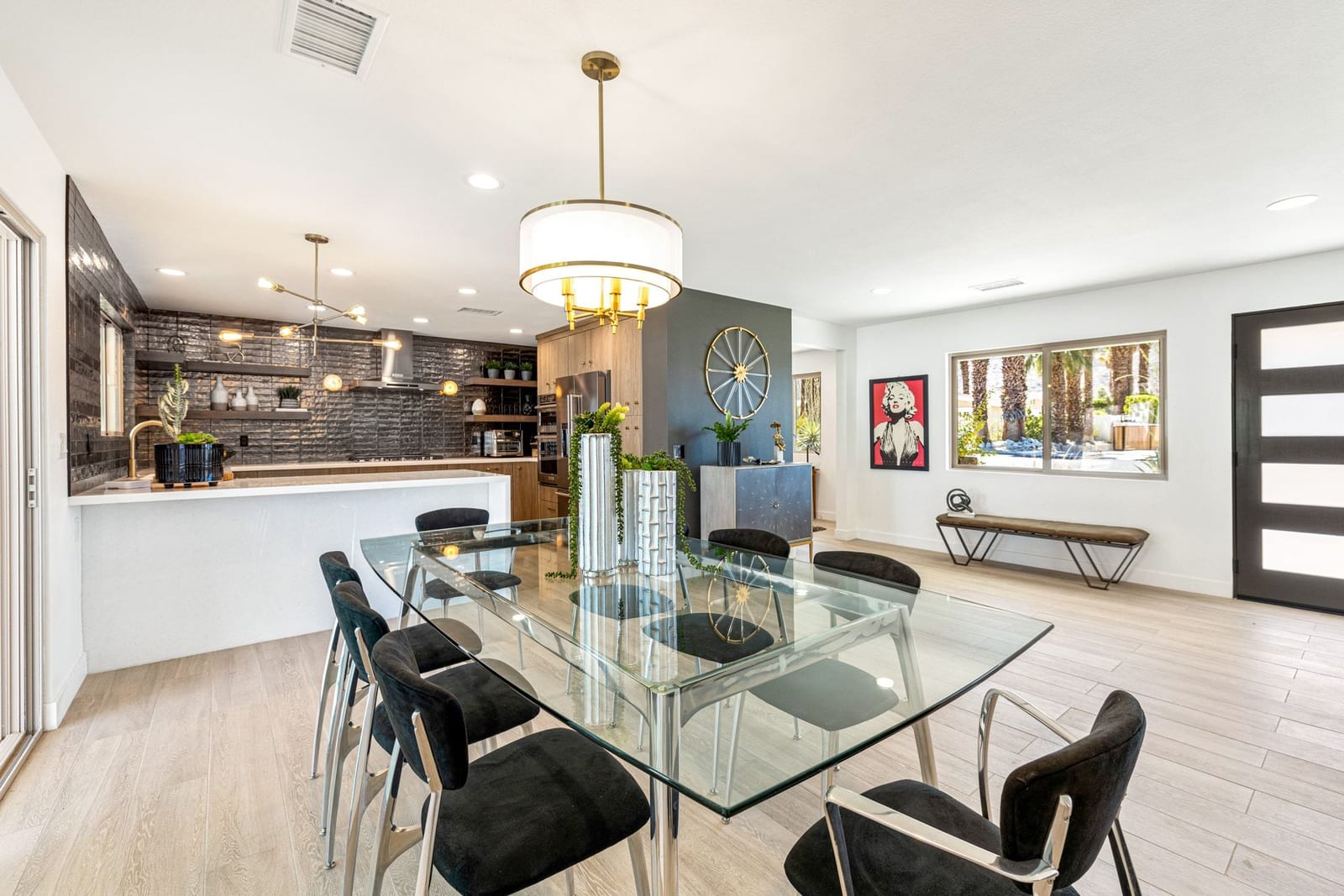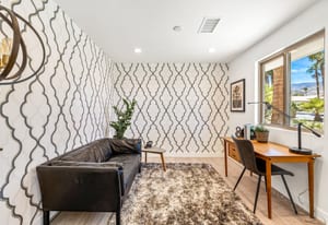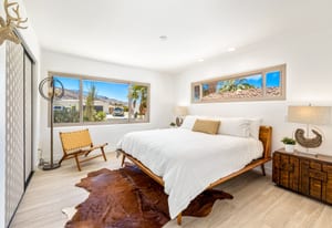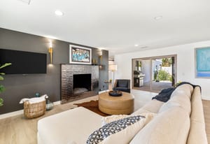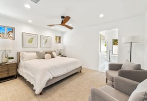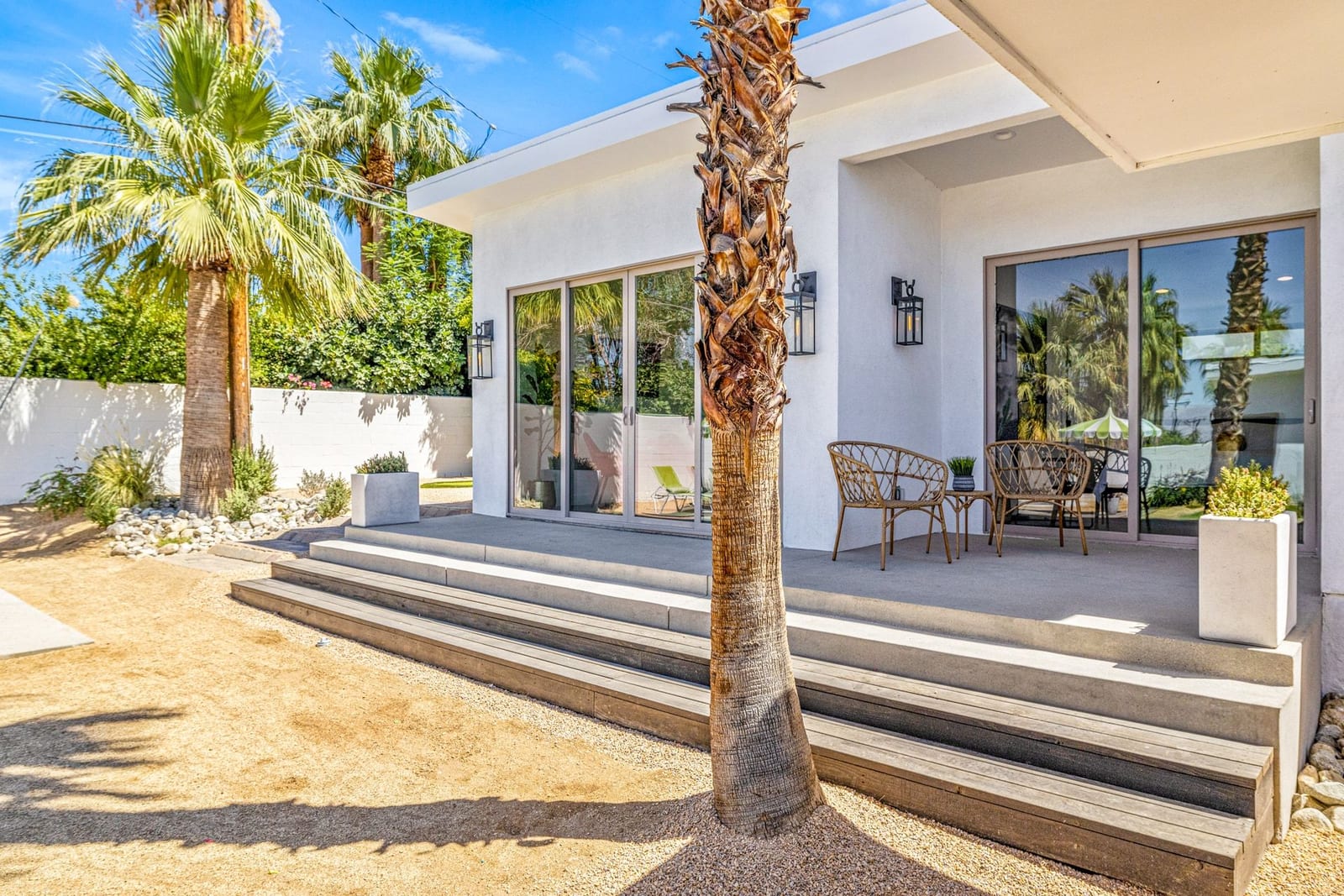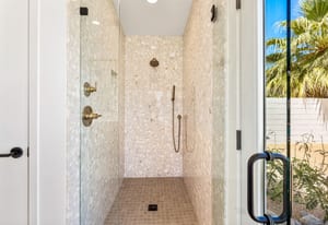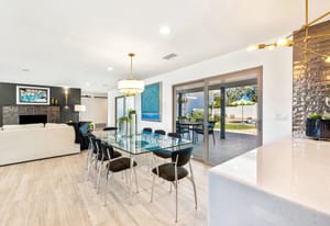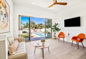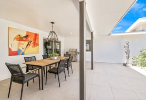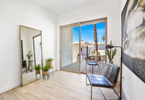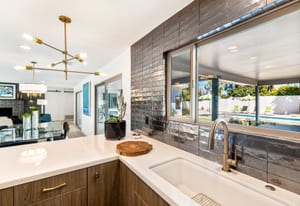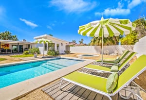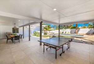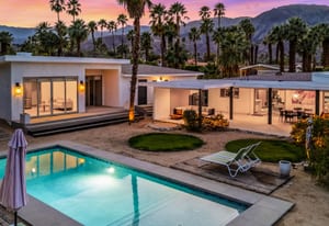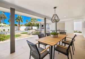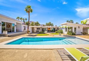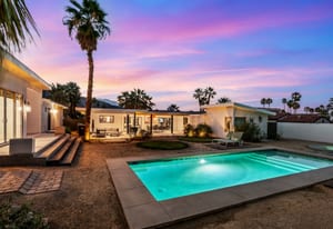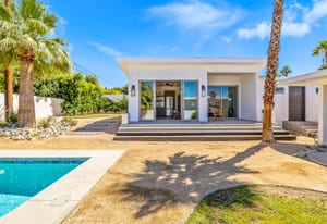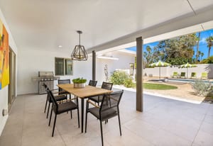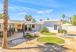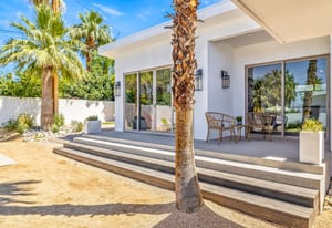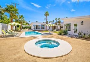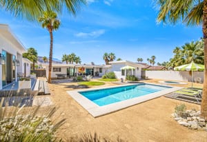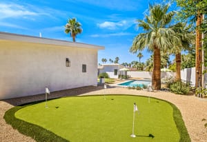 Moments from the boutiques, galleries, and dining of the famed El Paseo Shopping District, this beautifully reimagined mid-century ranch style home captures the essence of relaxed desert living on an expansive .35-acre parcel in South Palm Desert. Originally built in 1950 and thoughtfully renovated from top to bottom, the residence blends timeless architectural character with contemporary design and modern comfort. Clean lines, open living spaces, and abundant natural light create a welcoming atmosphere throughout the home. At the heart of the residence, the chef's kitchen has been completely transformed with professional grade appliances, sleek custom cabinetry, floating shelves, and a striking waterfall island designed for both everyday living and effortless entertaining. The open concept great room features a gas burning fireplace, designer tile flooring, and views that extend toward the surrounding mountains. The primary suite offers a tranquil retreat with a sitting area, walk-in closet, and a beautifully renovated bath featuring a soaking tub, dual vanities, and direct access to the pool and spa. Two additional bedrooms, including a private poolside casita connected by a breezeway, provide comfortable accommodations for guests while maintaining privacy and flexibility. Outdoors, the property unfolds as a private resort. A newly constructed pool and spa anchor the grounds, complemented by multiple lounging and dining areas, mature desert landscaping, and generous open space rarely found so close to El Paseo. Adjacent to the casita, a private putting green creates a playful and relaxed outdoor amenity, perfect for practicing your short game or entertaining guests. Adding to the home's versatility, the property offers a four-car garage and dedicated RV parking, providing exceptional space for vehicles, recreational equipment, or additional storage, a rare convenience in this coveted South Palm Desert location. Offering architectural charm, modern upgrades, and an exceptional location, this distinctive property presents a rare opportunity to experience the very best of desert living.