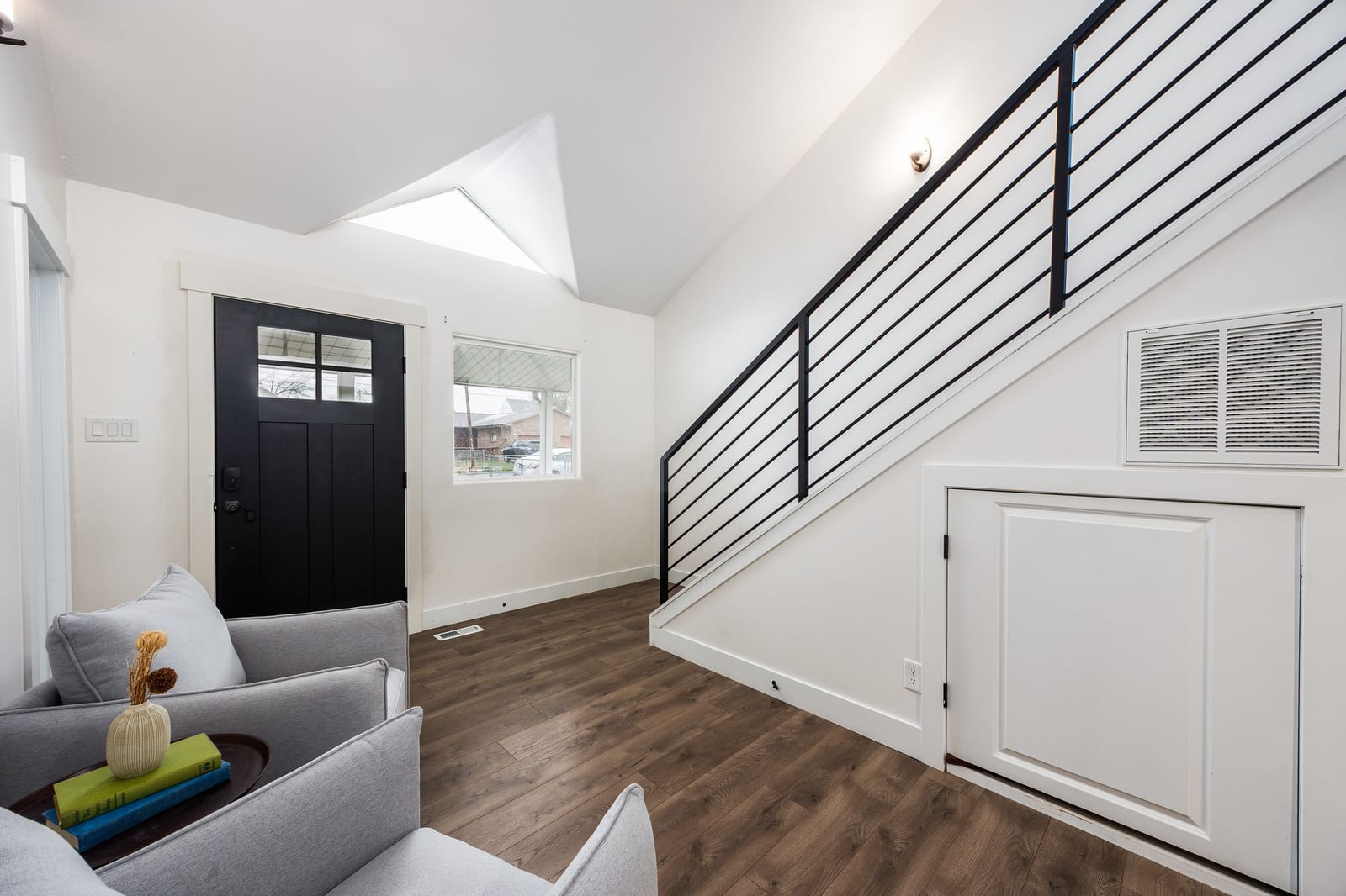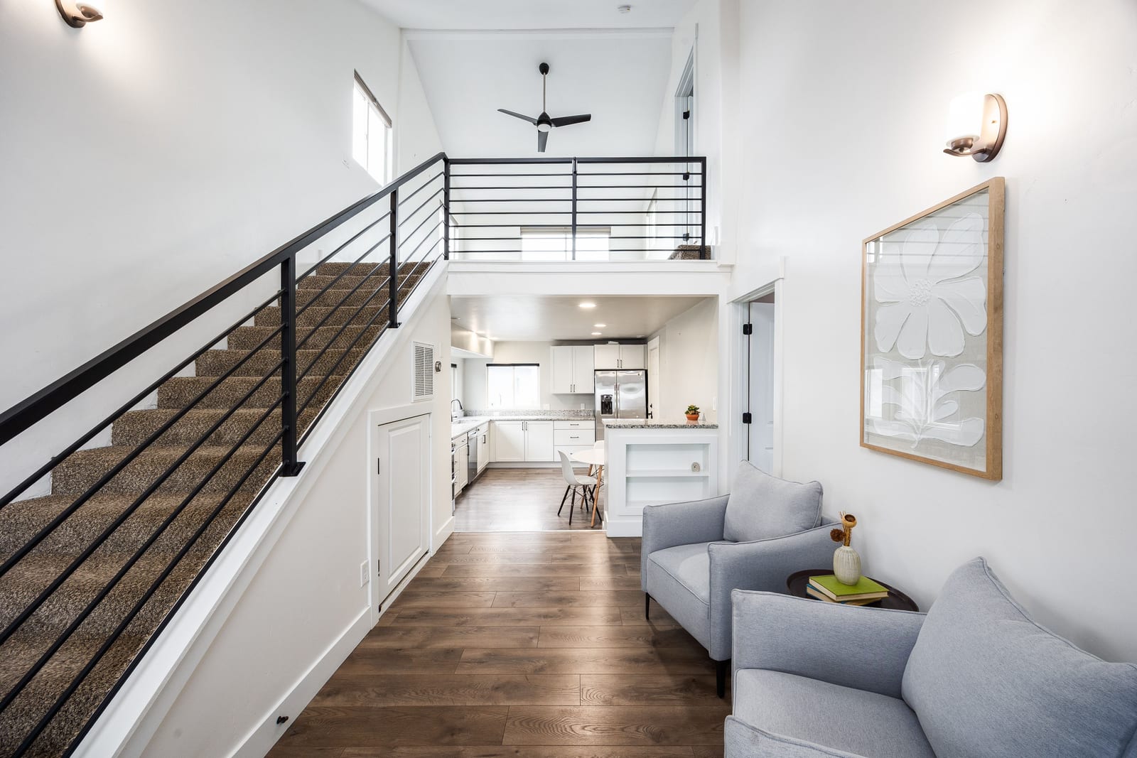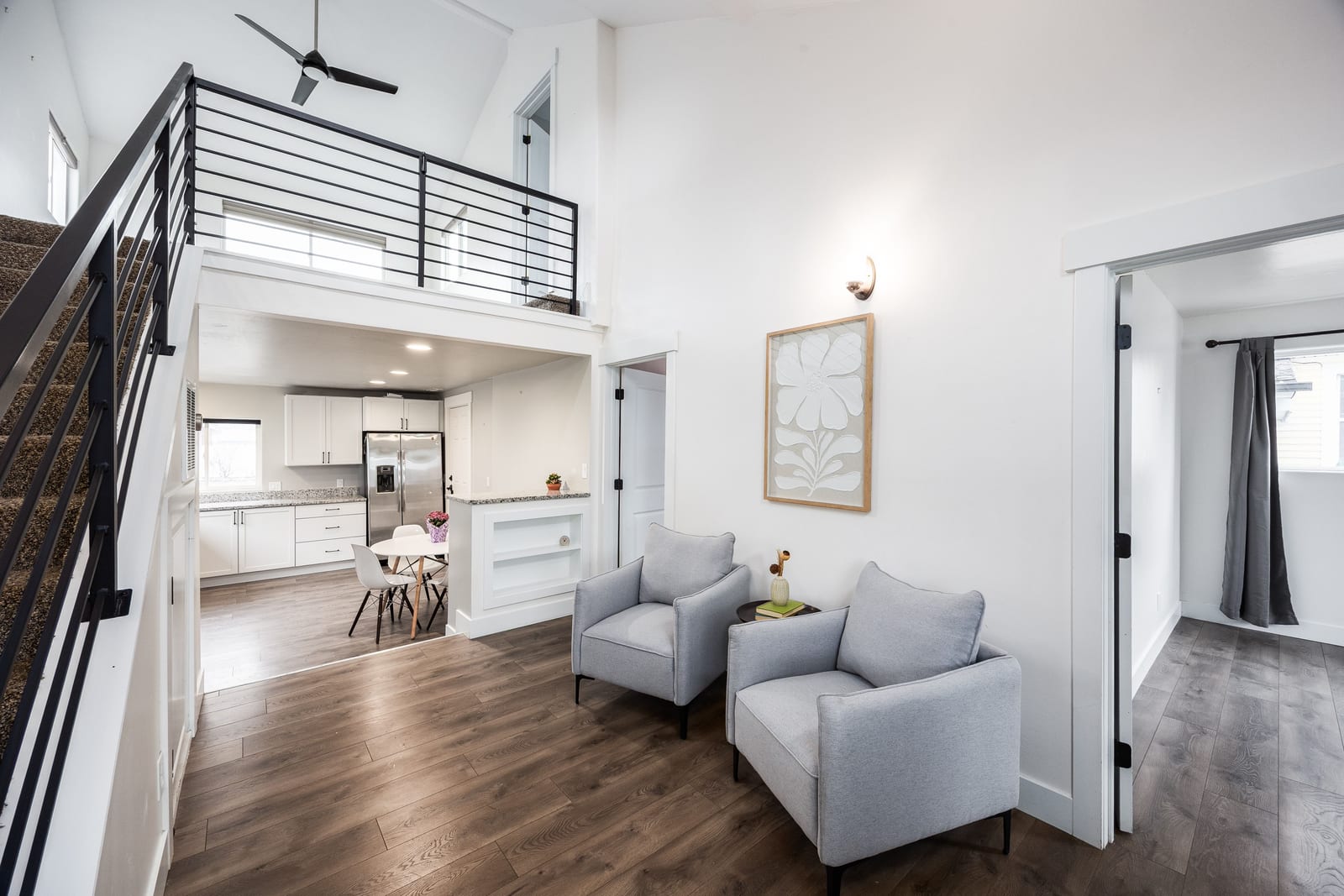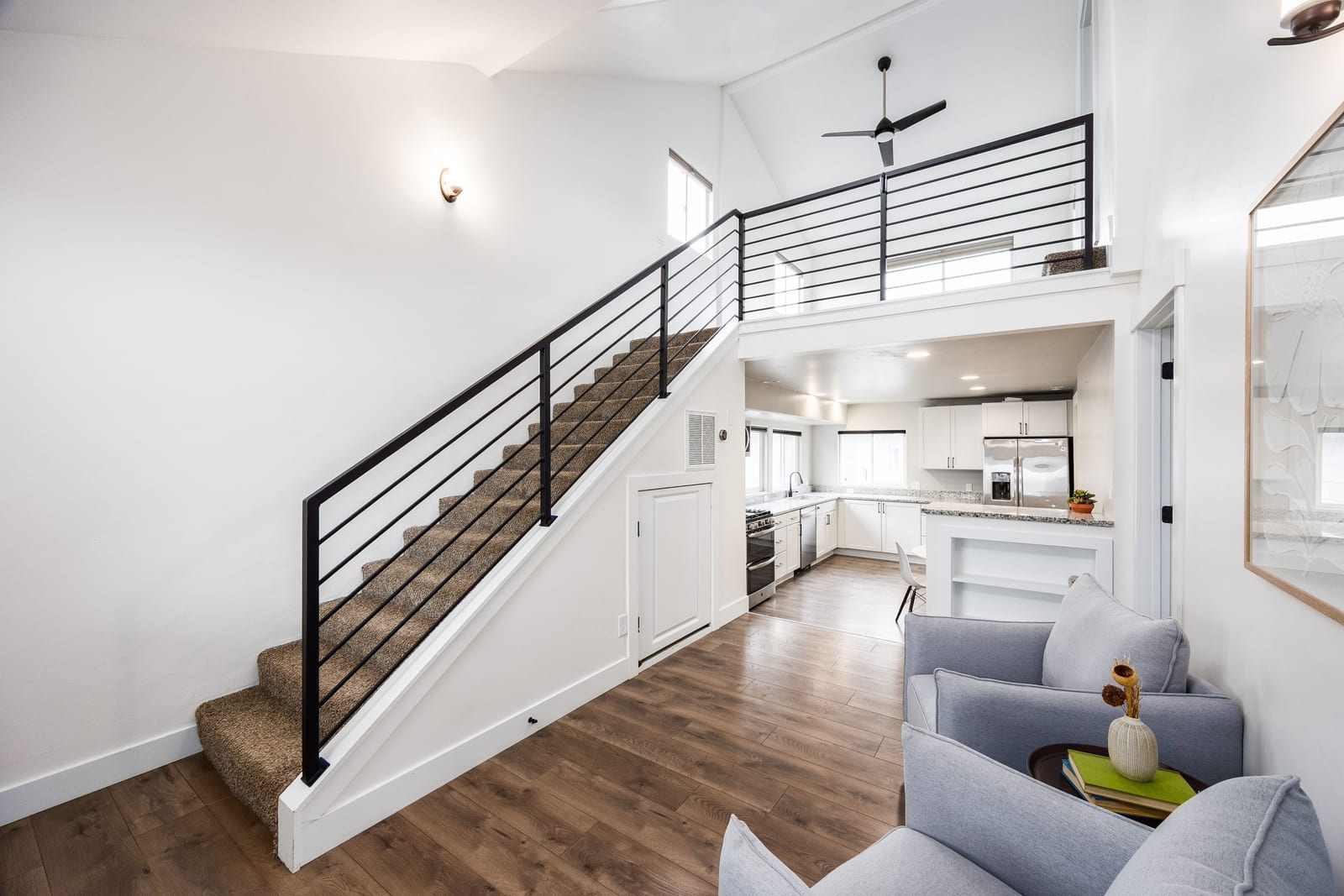 Modern lines, vaulted ceilings, and an open loft give this South Salt Lake home architectural presence you don't typically see at this price point. The kitchen is crisp and functional with white shaker cabinetry, granite counters, stainless appliances, and excellent natural light. Black iron railings and warm flooring add contrast and character throughout. Out back, the tiered yard was designed for gathering - a sunken concrete lounge, defined garden beds, native plantings, fruit trees, and space to actually entertain. Detached garage with room for storage or workshop. Convenient location with quick access to downtown, Sugar House, and I-80.