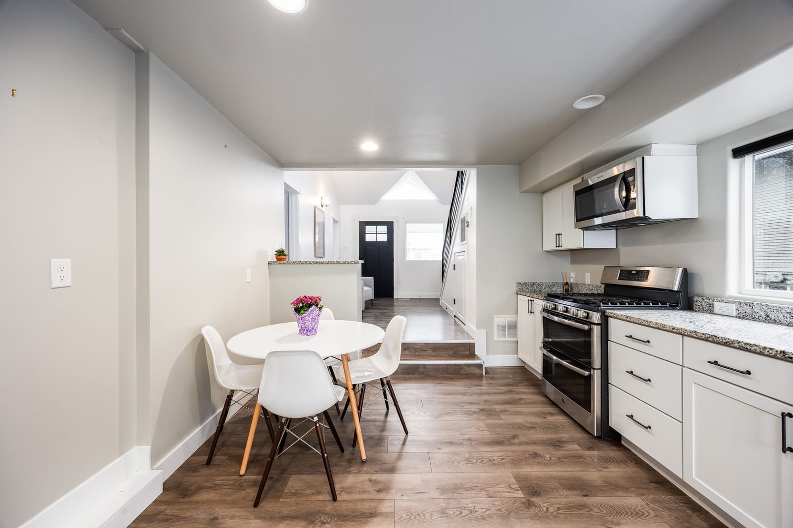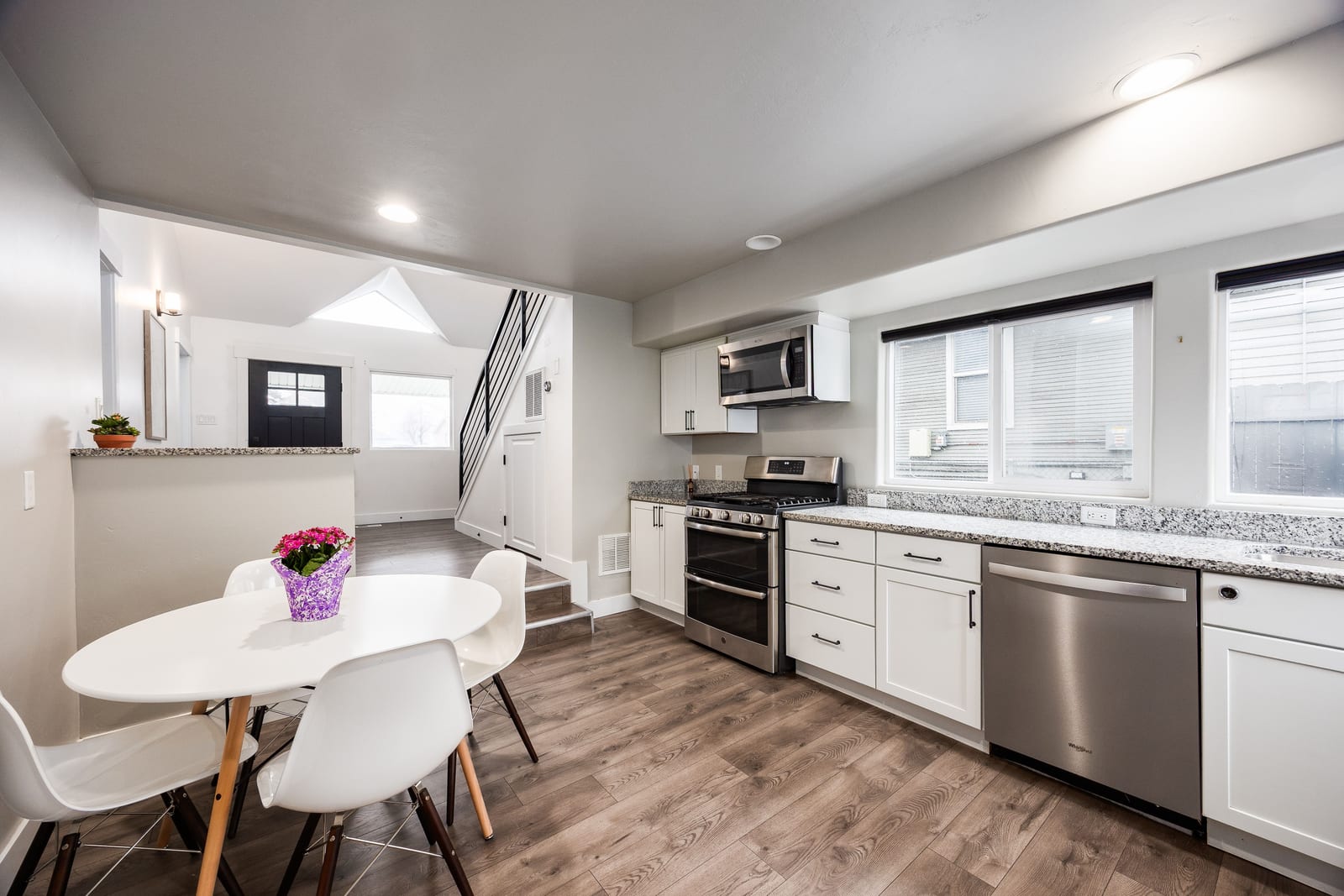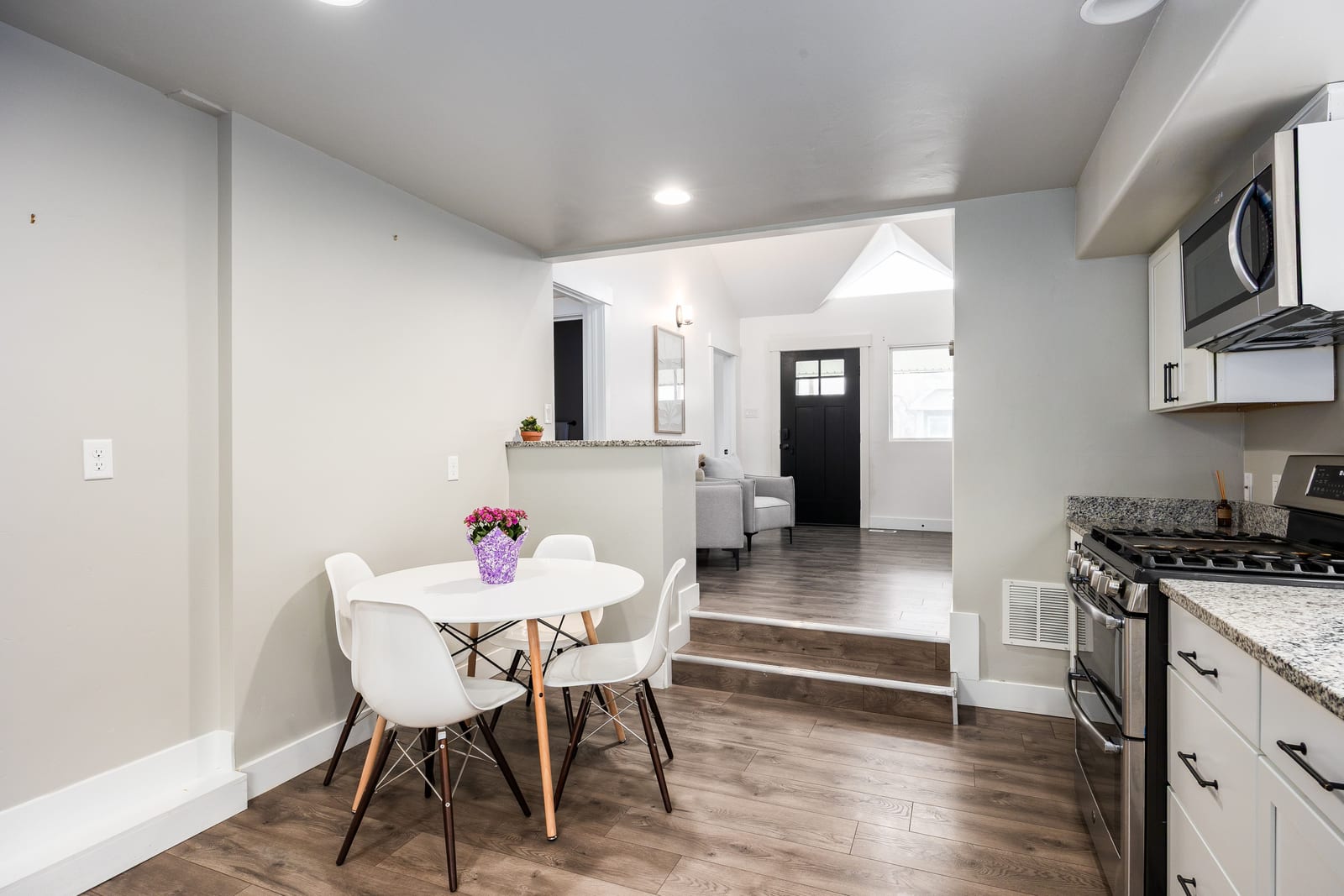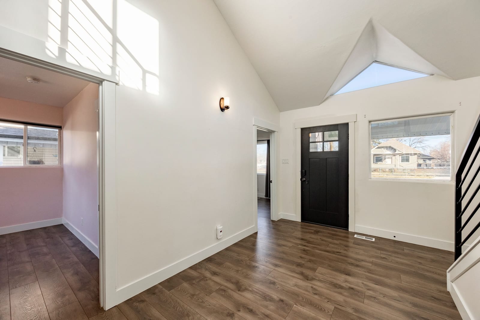 Modern lines, vaulted ceilings, and an open loft give this South Salt Lake home architectural presence you don't typically see at this price point. The kitchen is crisp and functional with white shaker cabinetry, granite counters, stainless appliances, and excellent natural light. Black iron railings and warm flooring add contrast and character throughout. Out back, the tiered yard was designed for gathering - a sunken concrete lounge, defined garden beds, native plantings, fruit trees, and space to actually entertain. Detached garage with room for storage or workshop. Convenient location with quick access to downtown, Sugar House, and I-80.