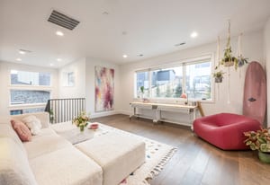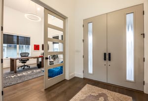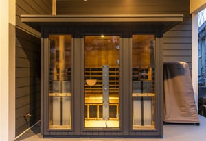 Additional highlights include engineered hardwood floors, a private office with French doors, electronic blinds, and a whole-home Sonos sound system extending to the covered back deck, where a Clearlight infrared sauna with red light therapy creates a spa-like outdoor wellness retreat.