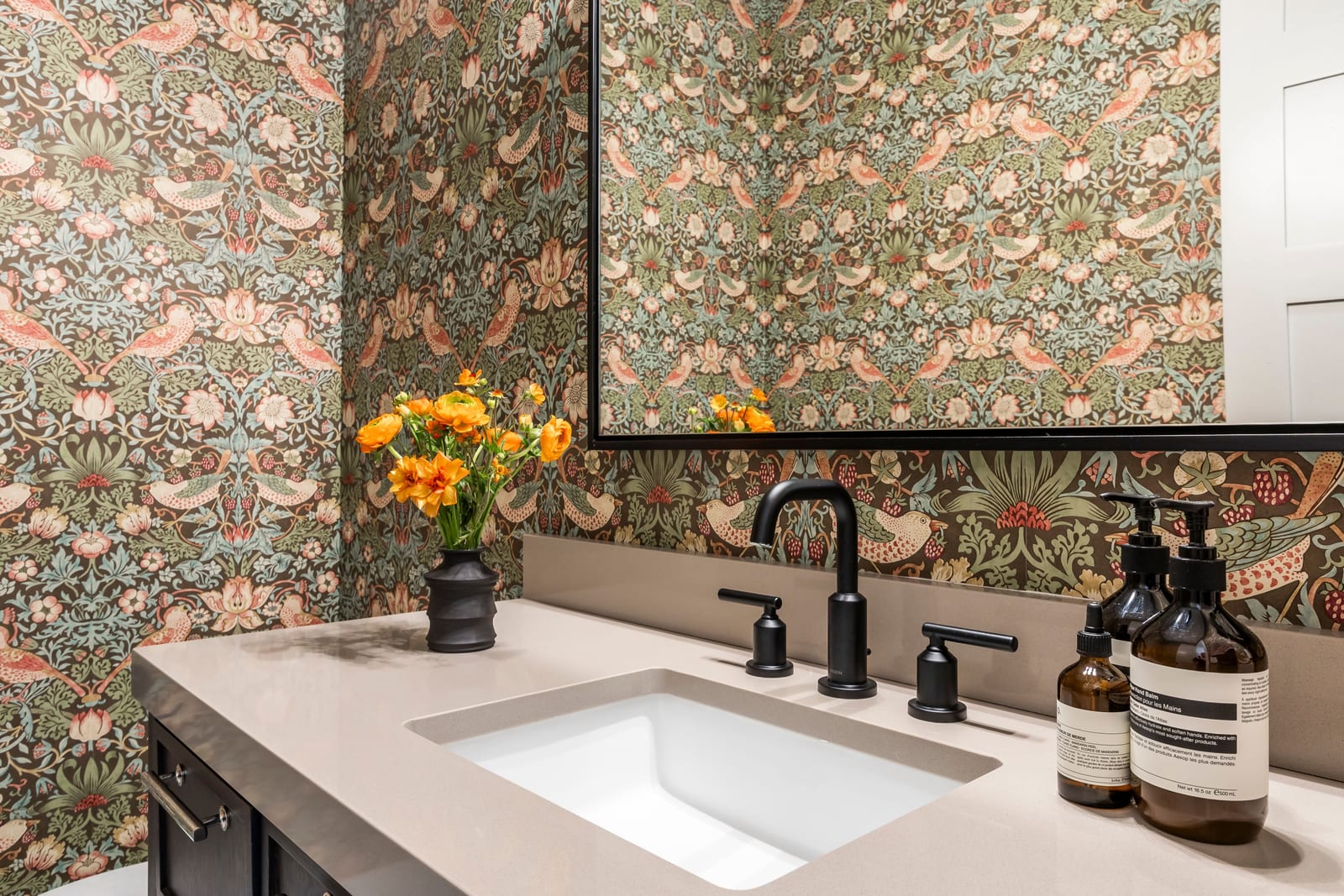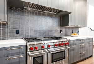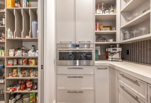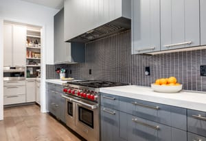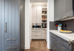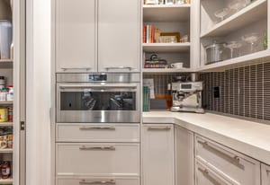 The chef’s kitchen features custom cabinetry, quartz countertops, and a full suite of premium Wolf appliances including a 48” gas range, steam oven, drawer microwave, ice maker, dishwasher, and custom-paneled refrigerator. A walk-in butler’s pantry enhances both functionality and entertaining flow.