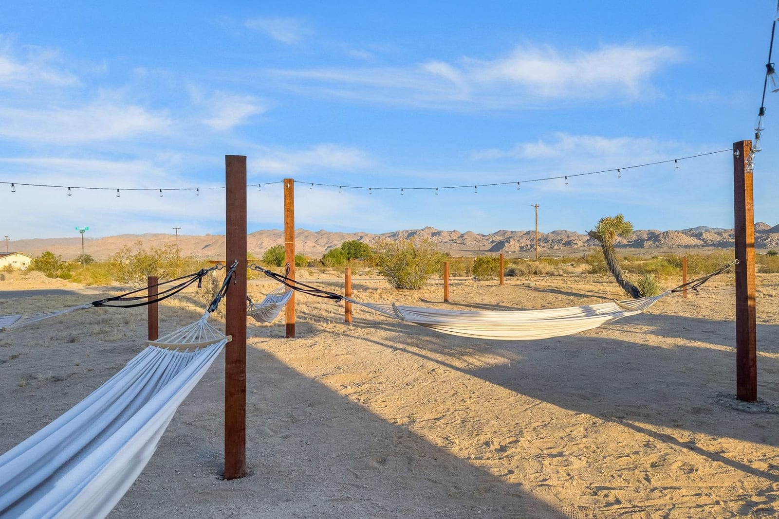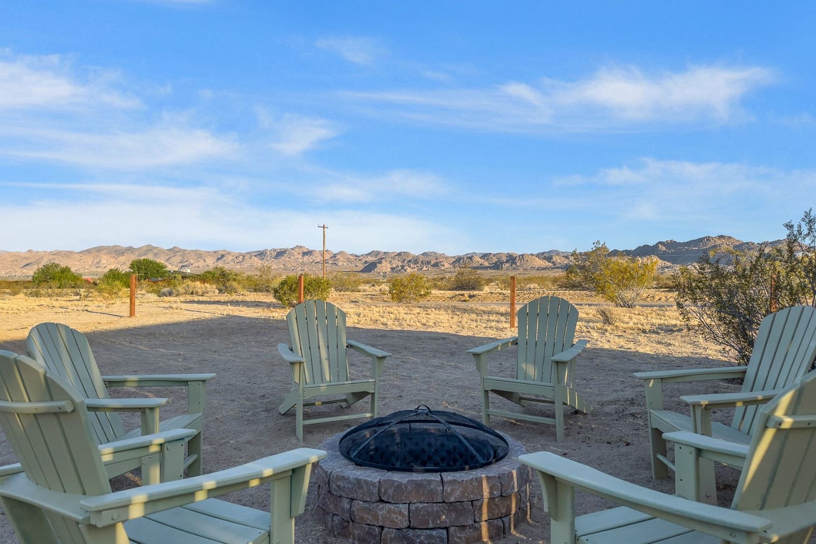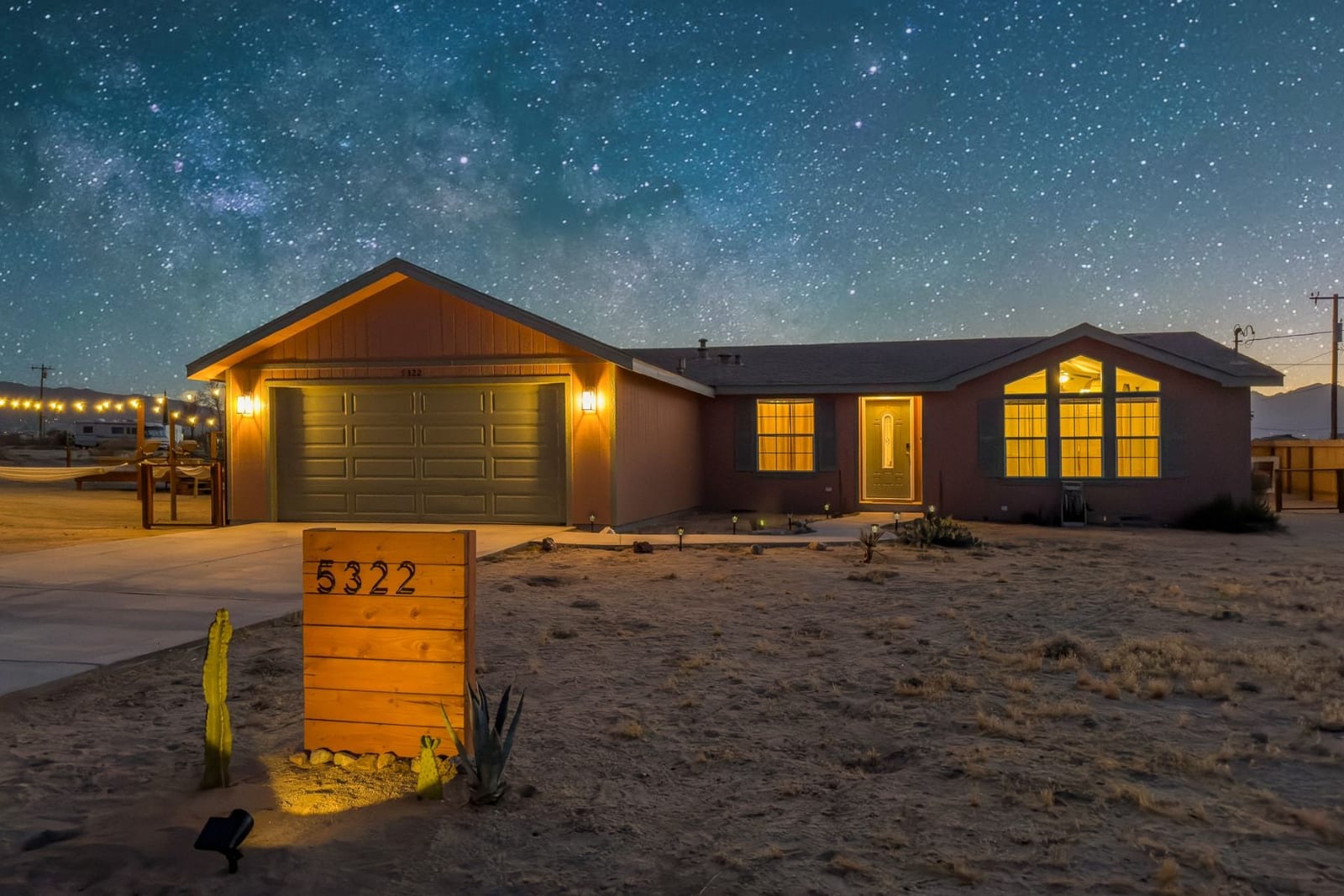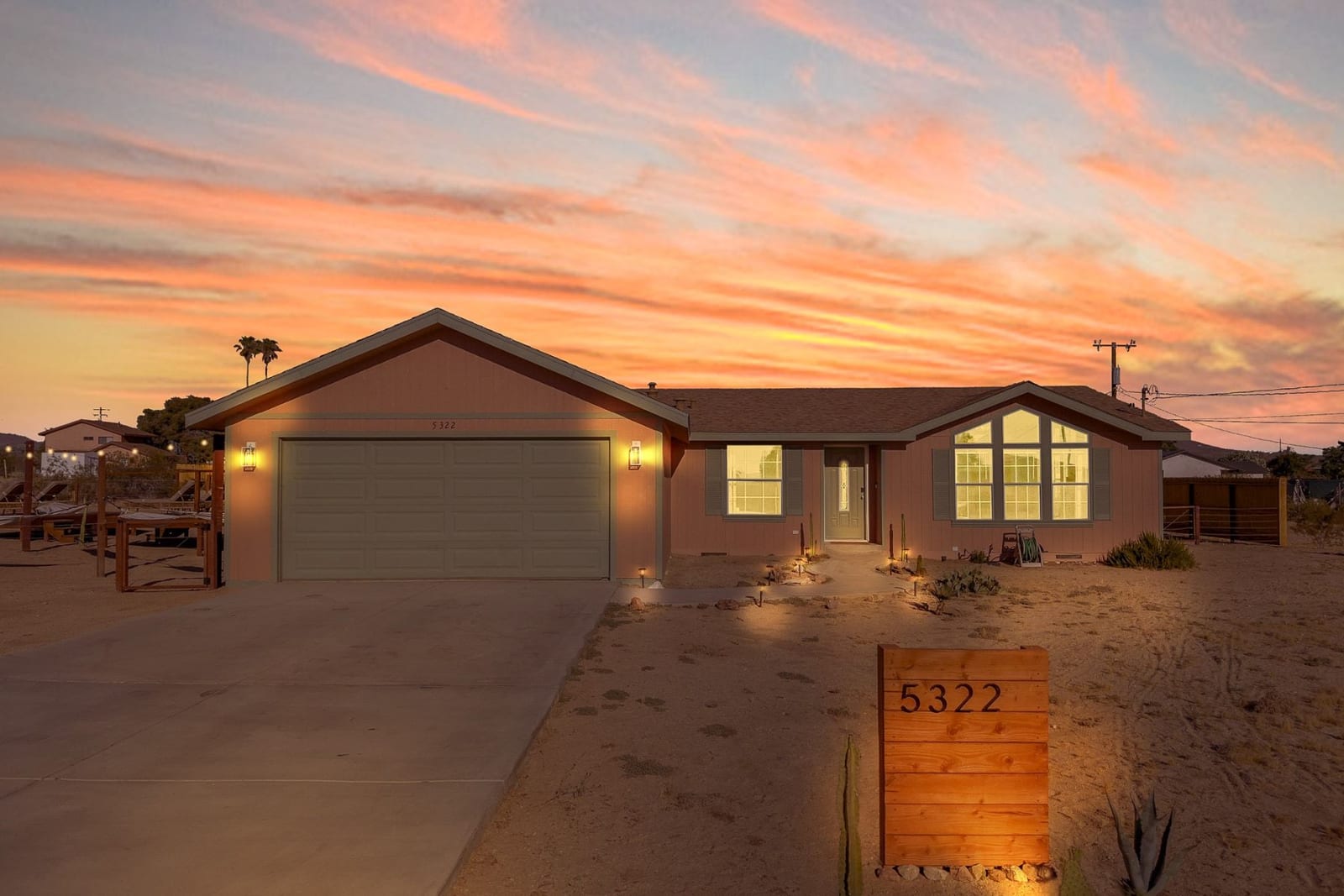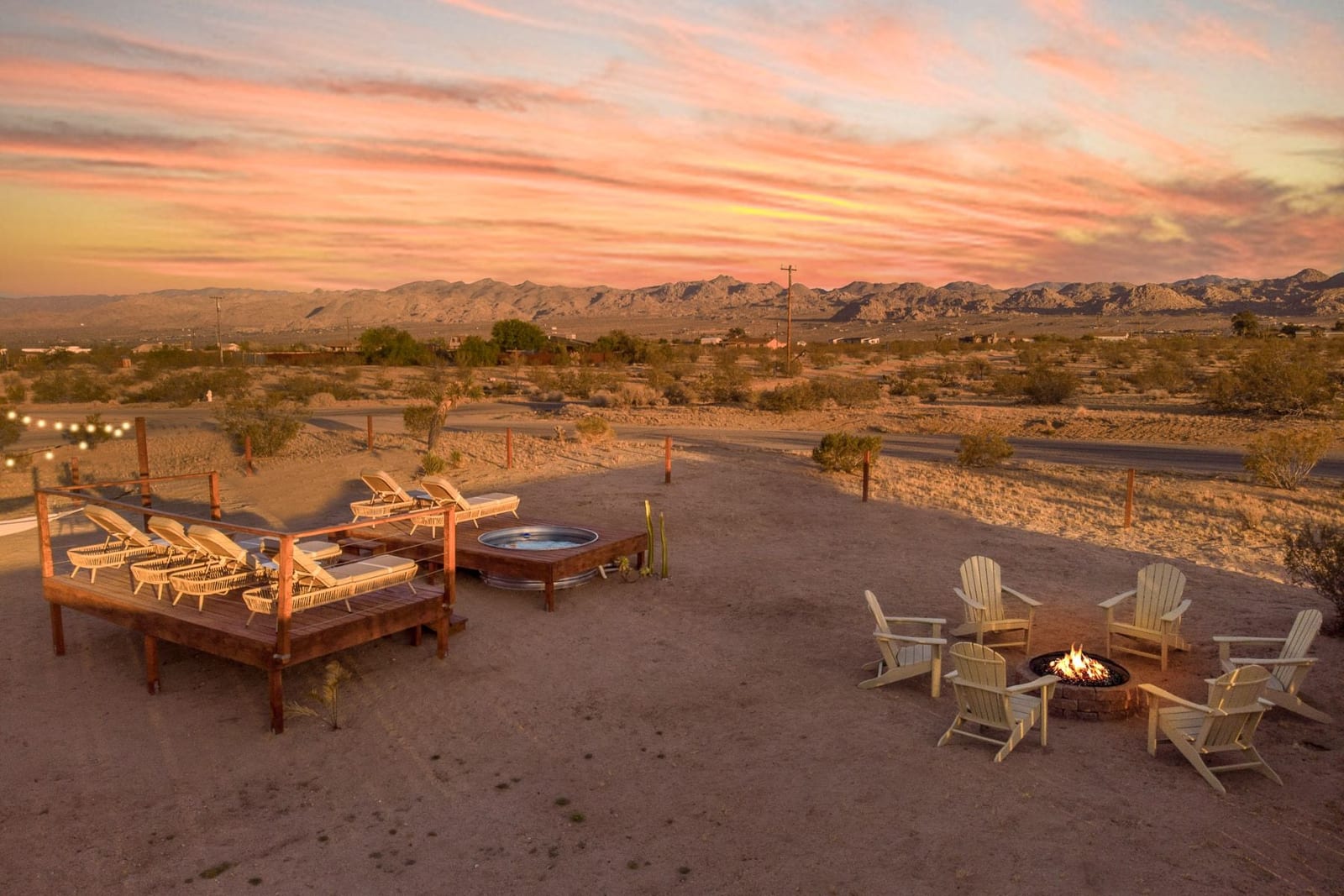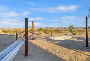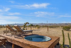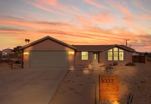 Joshua Tree 3-bedroom desert retreat in the Sunfair area just minutes from Joshua Tree National Park, offering expansive views, outdoor living, and unforgettable stargazing nights. Welcome to Leaning Joshua, a spacious high-desert retreat set beneath the wide open skies of one of Joshua Tree's most desirable neighborhoods. Inside, the home features an inviting open living area, a dining space ideal for gathering, and a fully equipped kitchen with modern appliances. Three comfortable bedrooms provide flexible accommodations for family, guests, or potential rental use. Step outside to experience the beauty of the surrounding desert landscape. The backyard is designed for outdoor living with a shaded seating area, chimenea, fire pit, BBQ grill, and multiple lounge spaces ideal for enjoying breathtaking sunsets and peaceful desert evenings. A custom deck with lounge chairs offers the perfect place to relax in the sun, while the cowboy tub provides a refreshing way to cool off while taking in the vast desert sky. Thoughtfully oriented for stargazing, the deck offers a front-row seat to Joshua Tree's remarkable night skies, including stunning views of the Milky Way and the moon rising along the eastern horizon as it travels across the desert sky. Surrounded by open desert landscape and minimal light pollution, the property offers exceptional privacy and some of the most spectacular stargazing skies the high desert is known for. Conveniently located near Joshua Tree Village, local shops, dining, and the entrance to Joshua Tree National Park, this property presents an excellent opportunity as a full-time residence, weekend getaway, or investment property in one of the high desert's most sought-after destinations.
