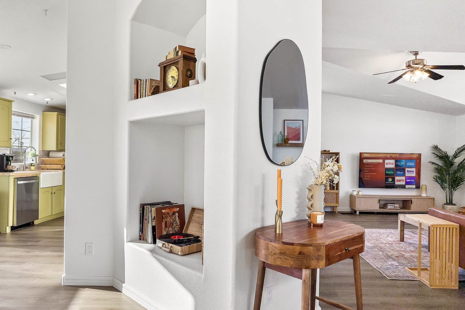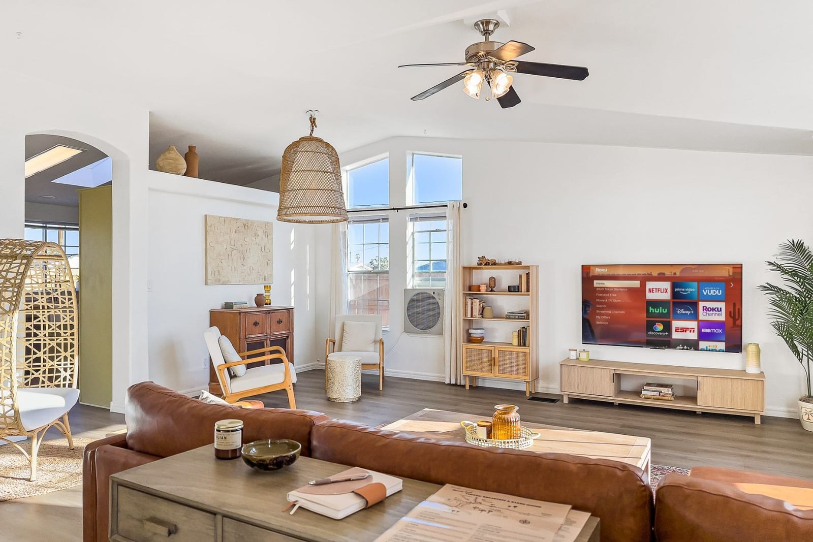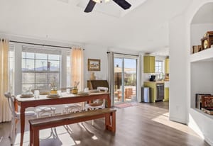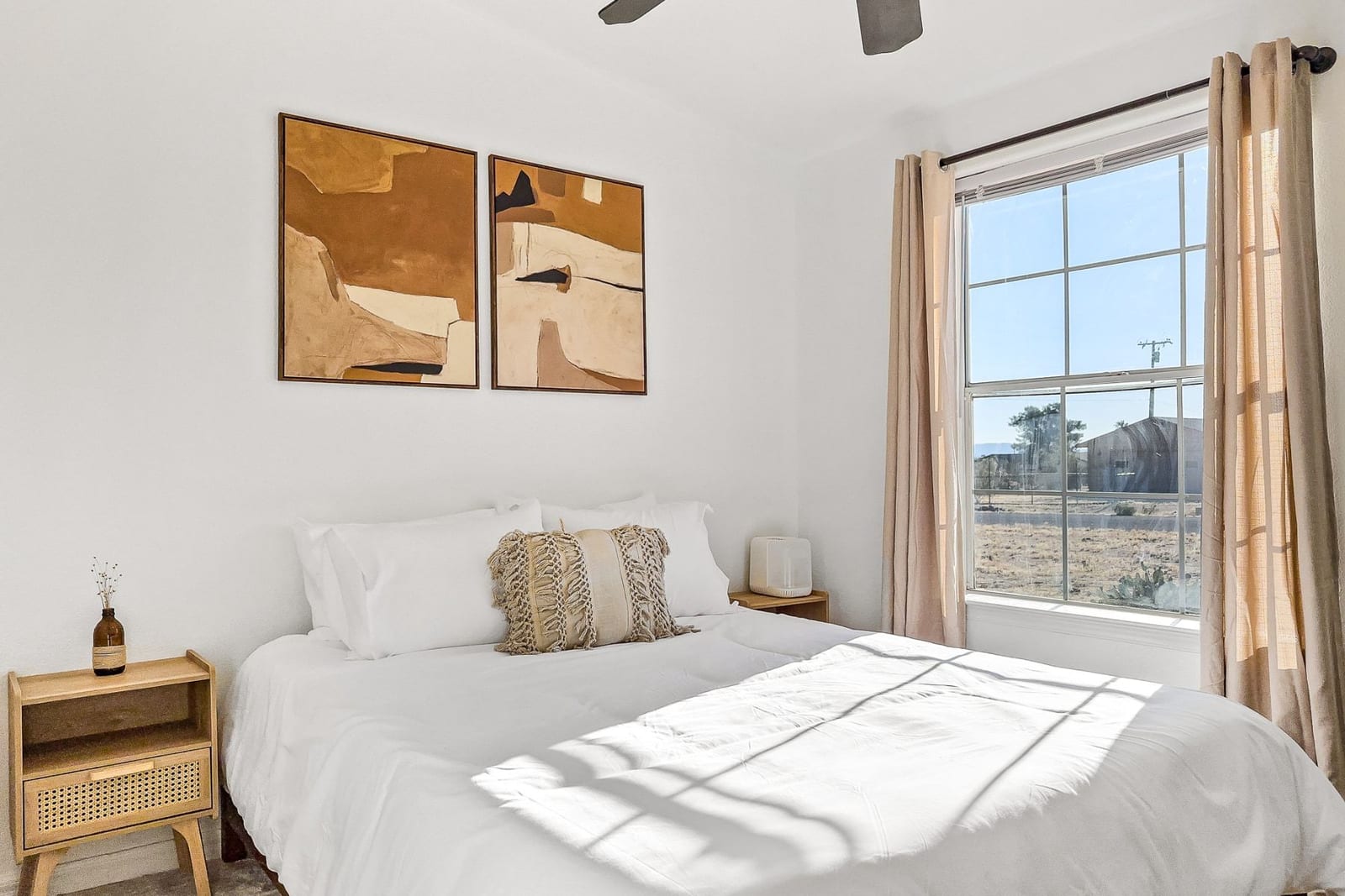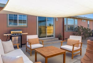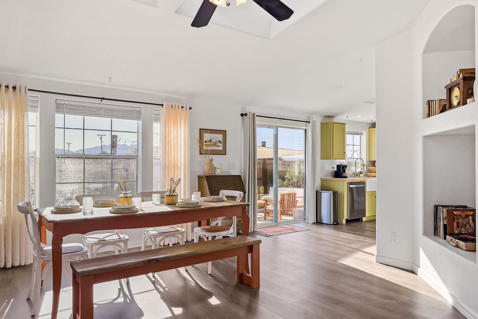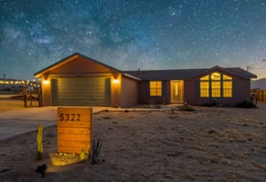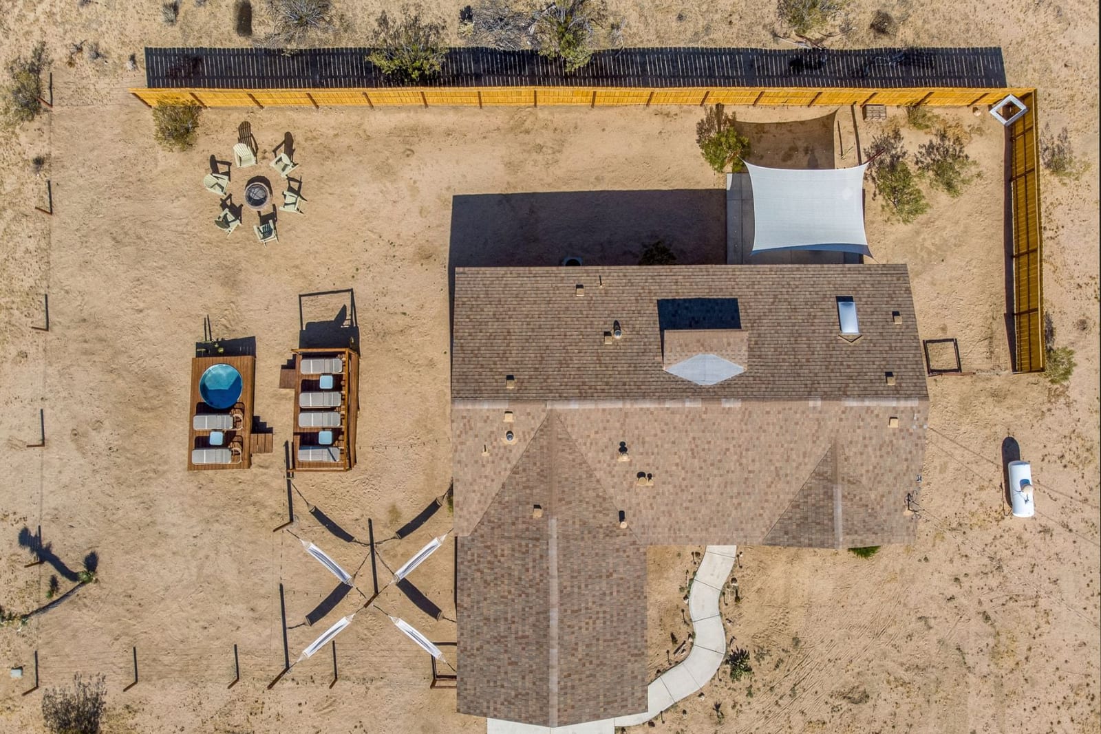 Joshua Tree 3-bedroom desert retreat in the Sunfair area just minutes from Joshua Tree National Park, offering expansive views, outdoor living, and unforgettable stargazing nights. Welcome to Leaning Joshua, a spacious high-desert retreat set beneath the wide open skies of one of Joshua Tree's most desirable neighborhoods. Inside, the home features an inviting open living area, a dining space ideal for gathering, and a fully equipped kitchen with modern appliances. Three comfortable bedrooms provide flexible accommodations for family, guests, or potential rental use. Step outside to experience the beauty of the surrounding desert landscape. The backyard is designed for outdoor living with a shaded seating area, chimenea, fire pit, BBQ grill, and multiple lounge spaces ideal for enjoying breathtaking sunsets and peaceful desert evenings. A custom deck with lounge chairs offers the perfect place to relax in the sun, while the cowboy tub provides a refreshing way to cool off while taking in the vast desert sky. Thoughtfully oriented for stargazing, the deck offers a front-row seat to Joshua Tree's remarkable night skies, including stunning views of the Milky Way and the moon rising along the eastern horizon as it travels across the desert sky. Surrounded by open desert landscape and minimal light pollution, the property offers exceptional privacy and some of the most spectacular stargazing skies the high desert is known for. Conveniently located near Joshua Tree Village, local shops, dining, and the entrance to Joshua Tree National Park, this property presents an excellent opportunity as a full-time residence, weekend getaway, or investment property in one of the high desert's most sought-after destinations.