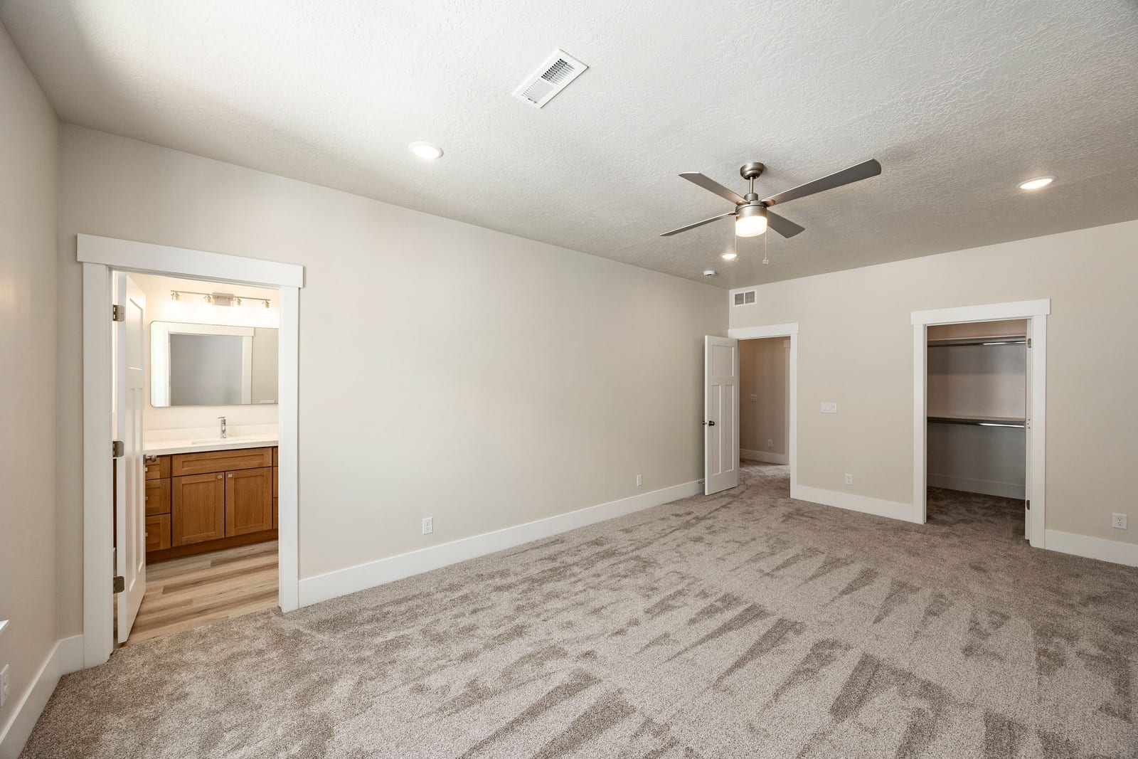 Three-bedroom Soho floor plan at The Ridge at Spanish Fork. This plan features the largest primary suite in the community. The lower level includes a family room and a deep two-car garage. The second level offers an open layout with kitchen, dining, family room, half bath, large laundry, and a versatile bedroom/office. The top floor has the oversized primary suite, plus another bedroom and full bath. The Ridge is located on the east side of Spanish Fork with sweeping mountain and valley views. Community amenities include a clubhouse, fitness center, indoor/outdoor pool, new pickleball courts, and a dog park. Convenient location near shopping, dining, schools, I-15, and Spanish Fork Canyon. Two, ...