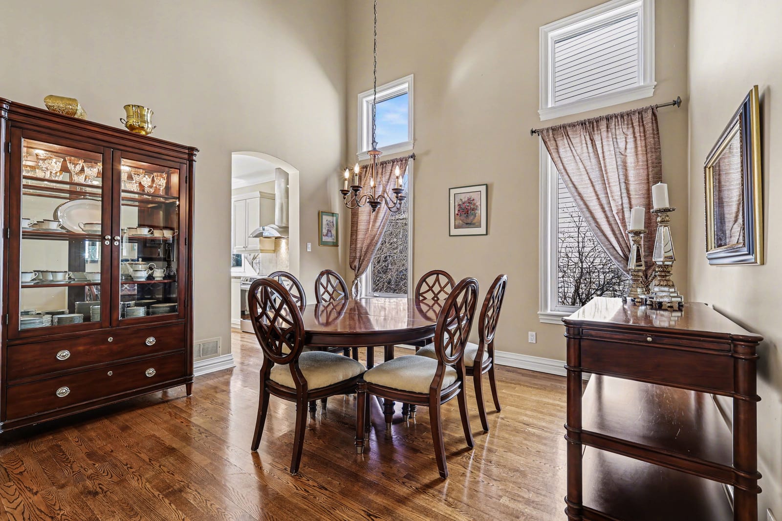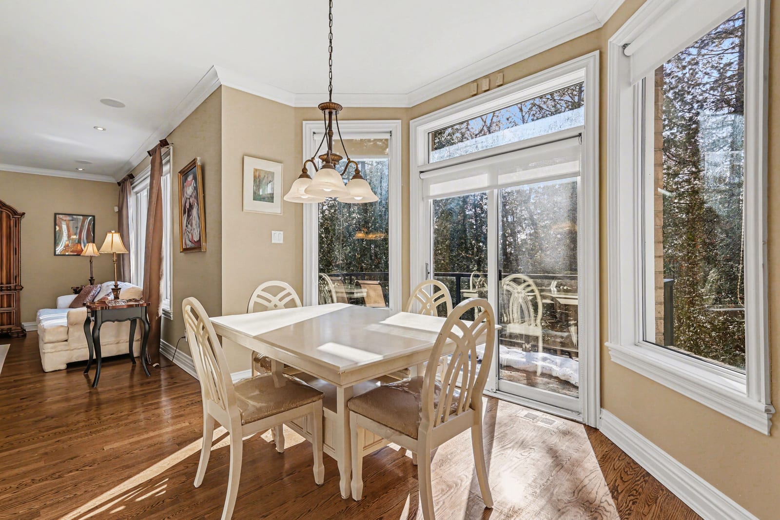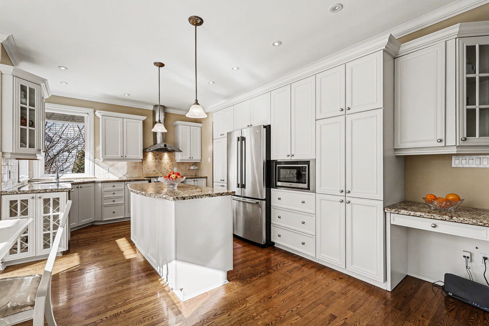 The formal dining room is perfectly positioned next to the kitchen and reflects the sophistication of the home with its soaring two-storey ceiling and oversized windows that flood the space with natural light. The eat-in kitchen is sure to impress any home chef, offering magazine-worthy finishes including rich cabinetry, luxurious granite countertops, a complementary backsplash, sleek stainless steel appliances, an oversized island, and bonus desk space. A patio door off the kitchen leads to the upper deck with elegant glass and iron railings — the perfect place to enjoy your morning coffee.
