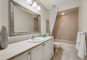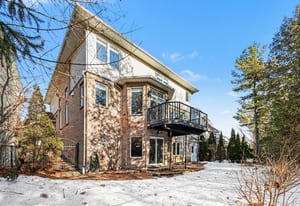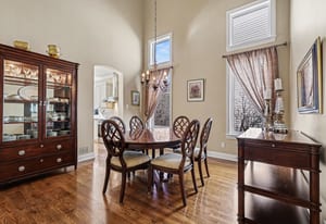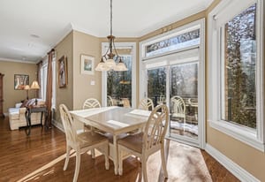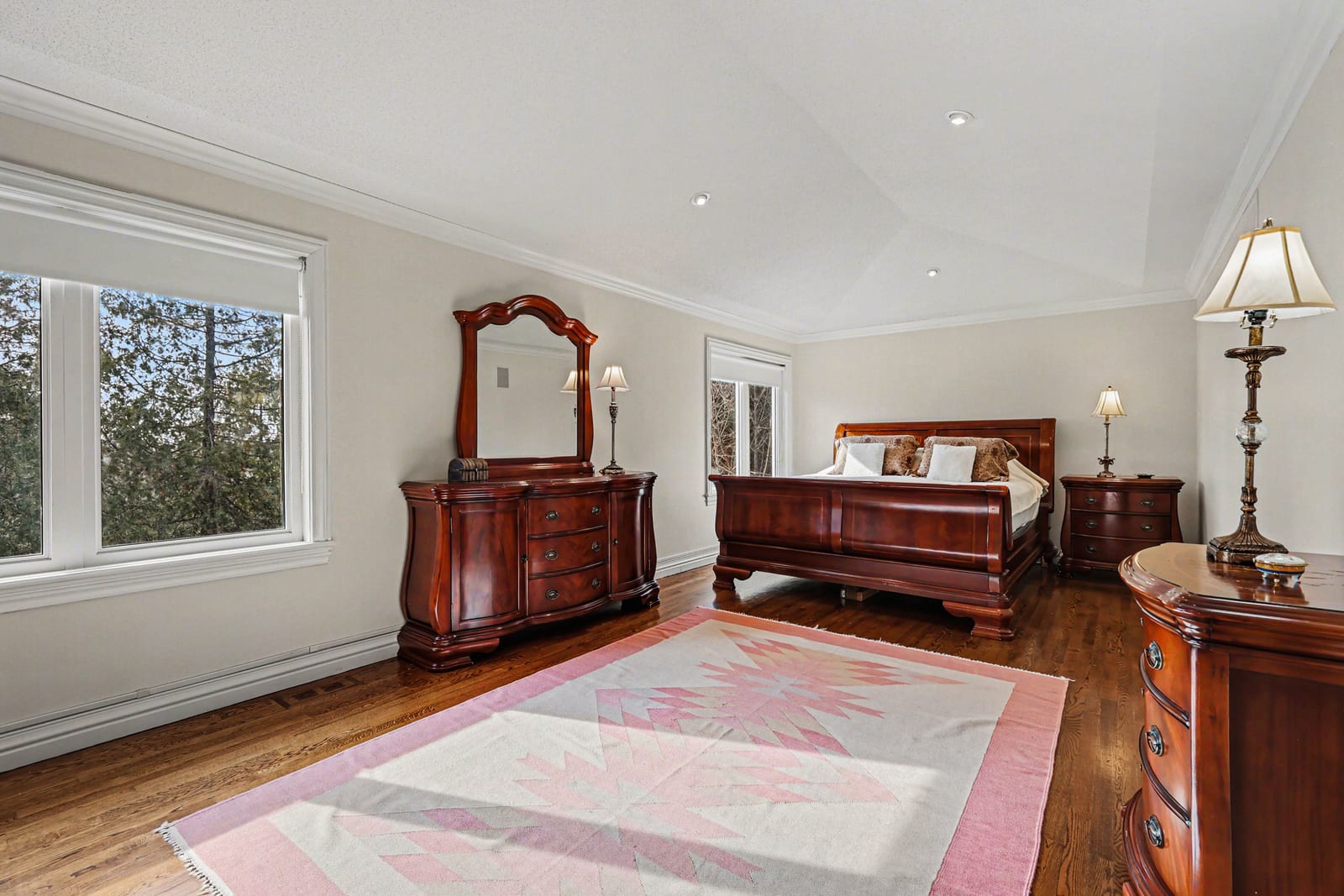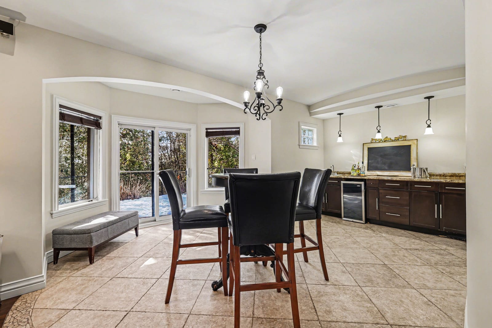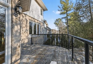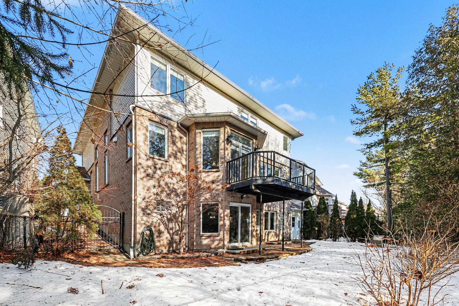 The formal dining room is perfectly positioned next to the kitchen and reflects the sophistication of the home with its soaring two-storey ceiling and oversized windows that flood the space with natural light. The eat-in kitchen is sure to impress any home chef, offering magazine-worthy finishes including rich cabinetry, luxurious granite countertops, a complementary backsplash, sleek stainless steel appliances, an oversized island, and bonus desk space. A patio door off the kitchen leads to the upper deck with elegant glass and iron railings — the perfect place to enjoy your morning coffee.