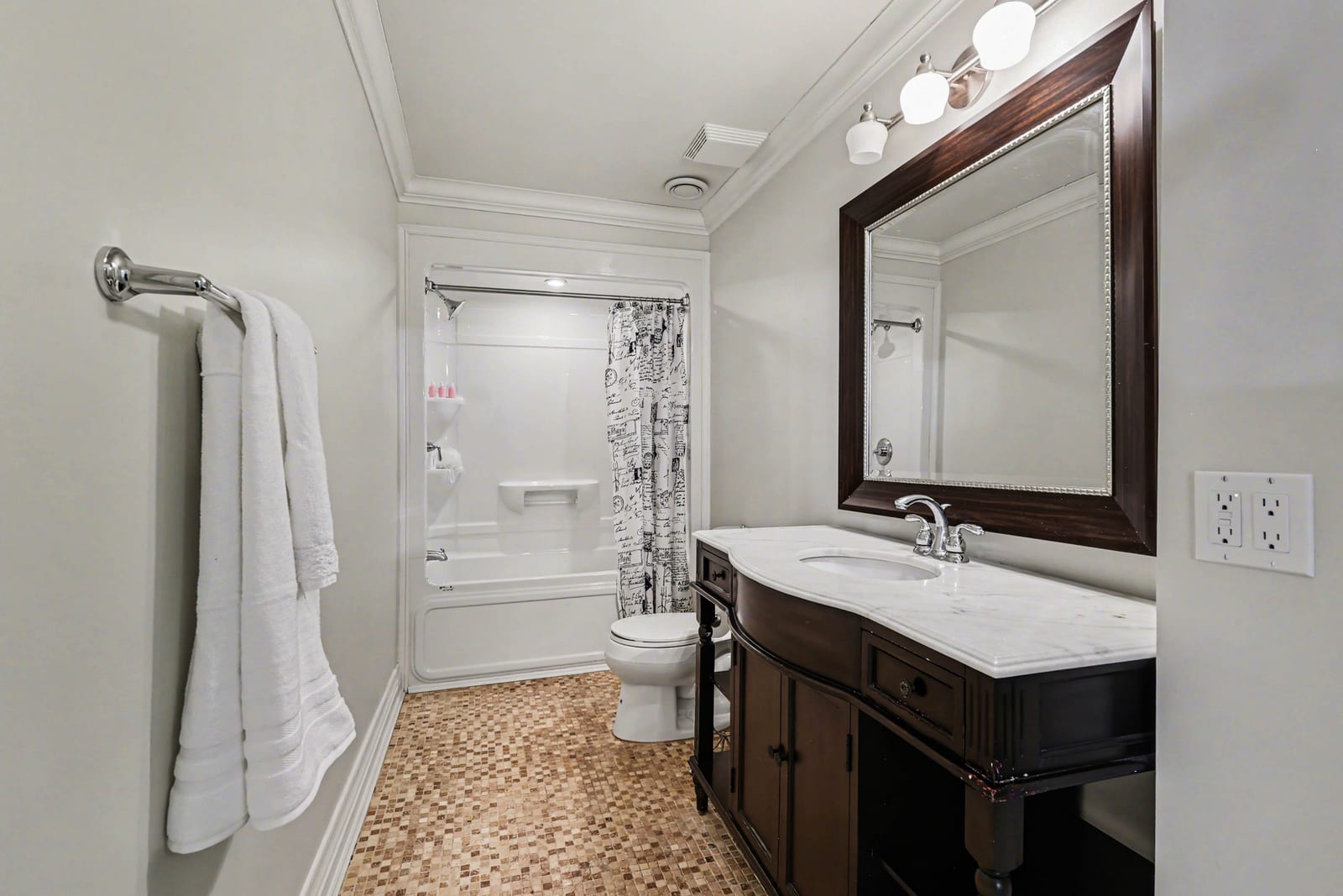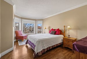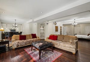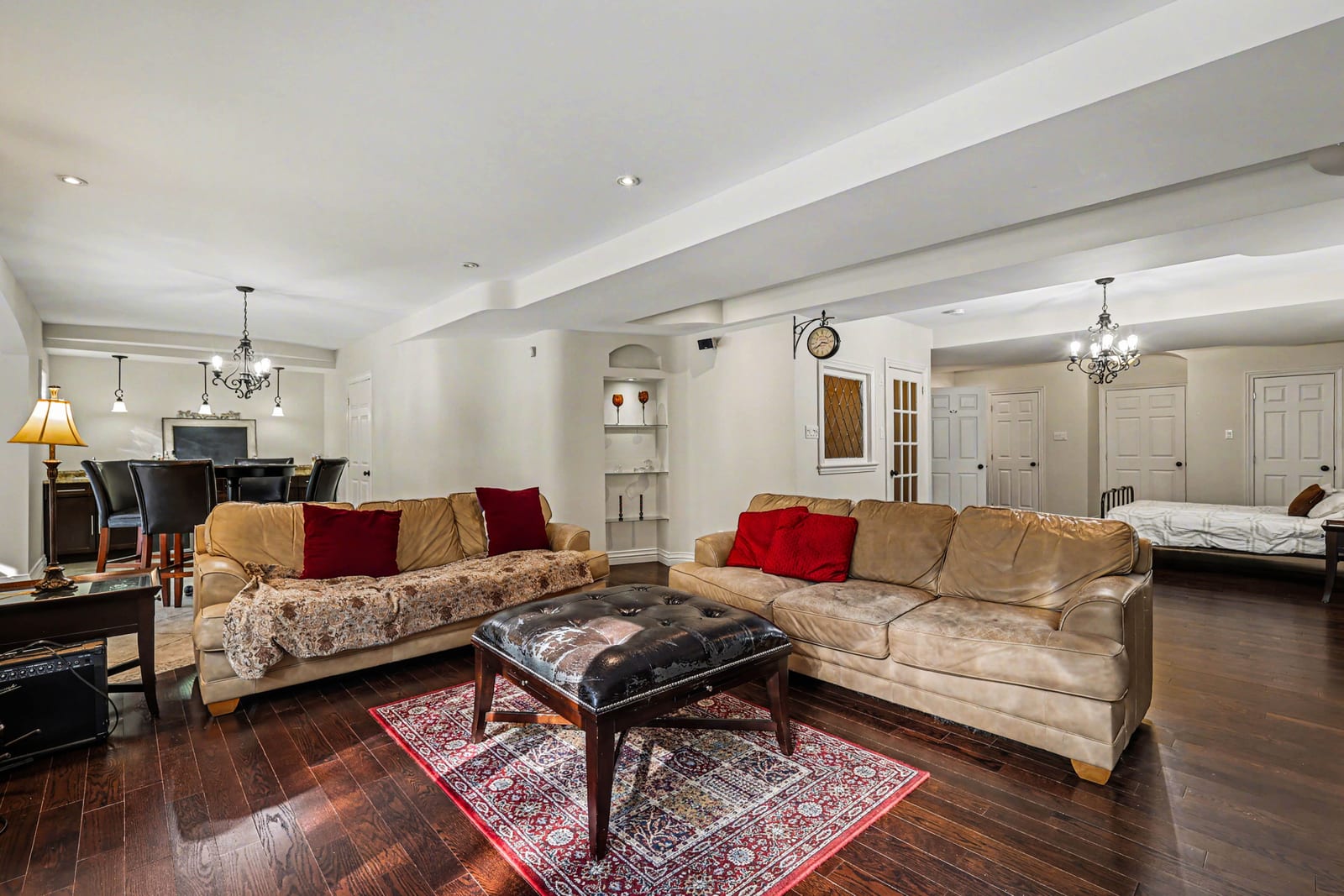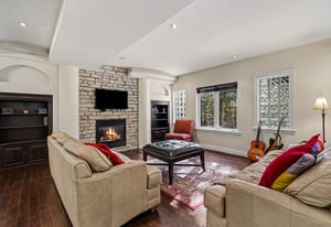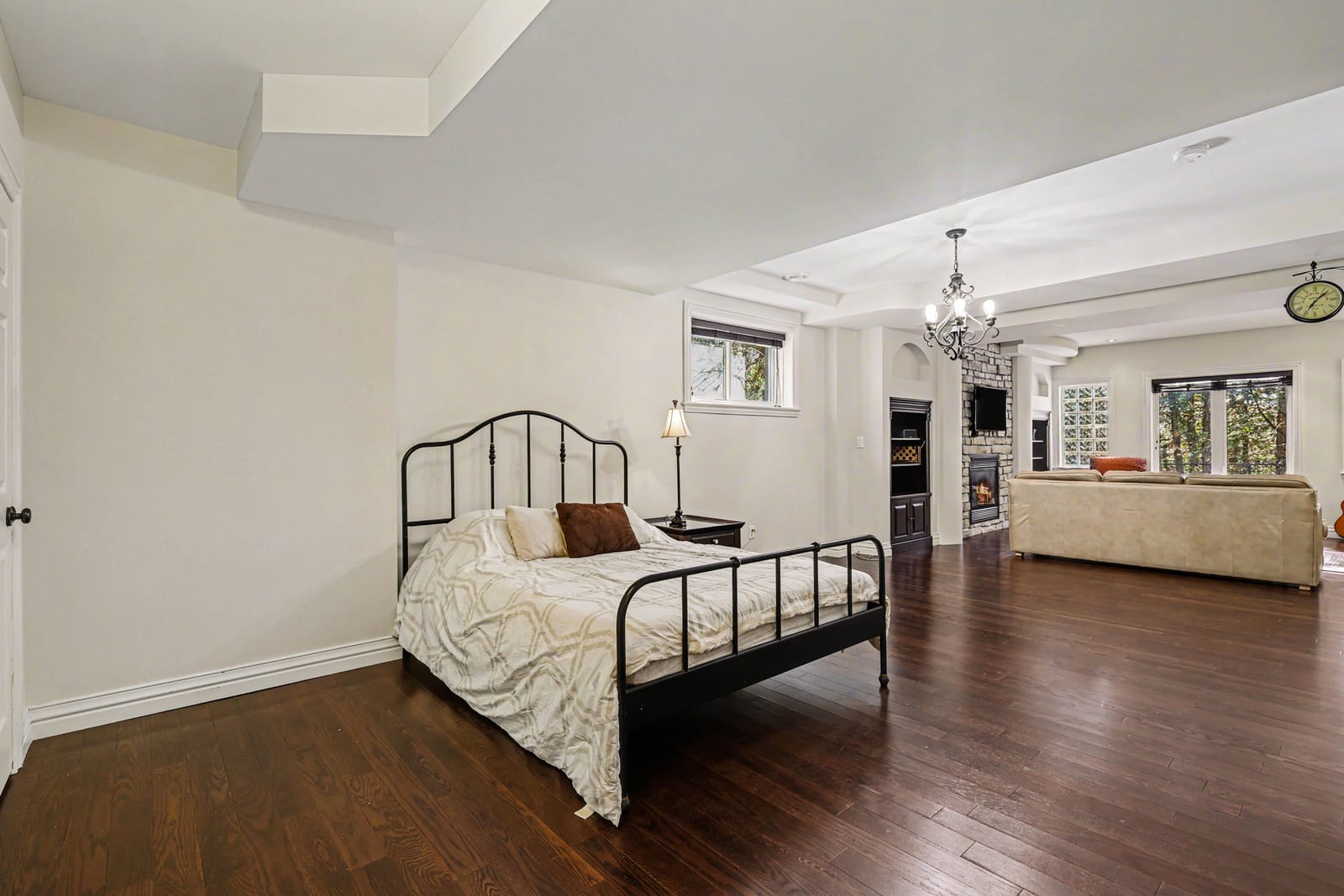Hardwood stairs continue to the fully finished walk-out basement, an exceptional extension of the living space that is ideal for a teenage retreat, visiting guests, or multigenerational living. This level features a dedicated area perfect for a bedroom complete with two closets, a lovely full bathroom, and a fantastic rec room anchored by a second gas fireplace with elegant stone surround and custom built-in shelving. A beautiful wet bar and dining area make entertaining effortless, while two separate storage rooms provide an abundance of practical storage space.