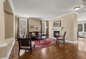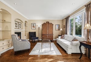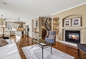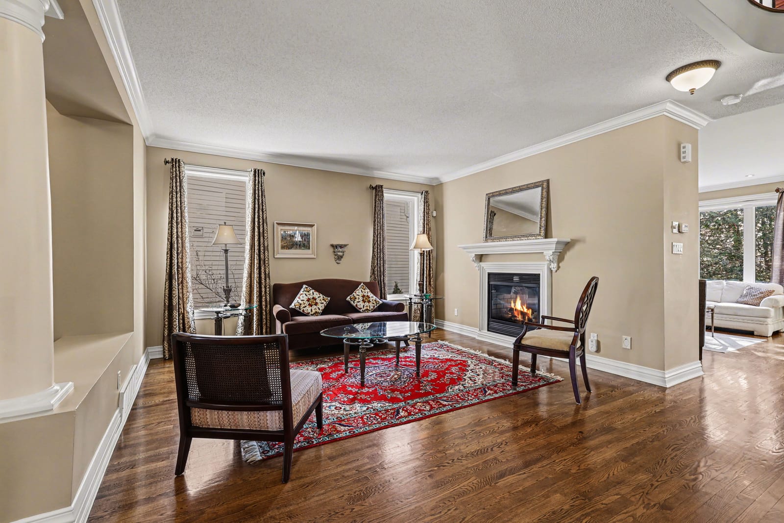 Step into the spacious foyer, where you are greeted with a wonderful view of this popular floor plan, thoughtfully designed with grand principal rooms and opulent finishes throughout. The formal living room is both elegant and inviting, highlighted by a unique two-sided gas fireplace that also serves the adjacent family room. This warm and comfortable gathering space is ideal for relaxing at the end of the day, featuring gorgeous built-in shelving flanking the fireplace and a large window overlooking the private backyard.
