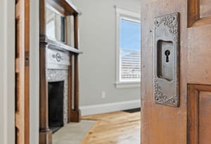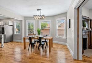 Original pocket doors between the living room and kitchen are still here - and still working! The living room itself is anchored by a wood-burning fireplace with its original wood mantel. Step through those doors and you'll find a kitchen that earns the word fantastic: large island with plenty of room to stay awhile, a large walk-in pantry, granite countertops, and stainless appliances. The bay-windowed dining room sits between the two, equally at home relaxing or hosting a dinner party.