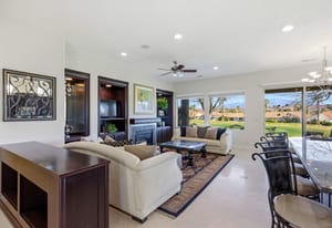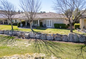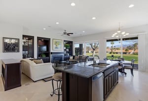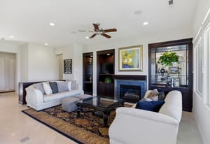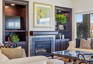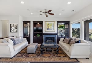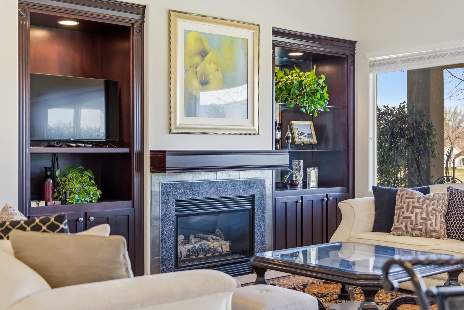 Designed with both elegance and comfort in mind, the open-concept floor plan features stone tile flooring, expansive windows, and abundant natural light that showcases the stunning red rock and mountain scenery. The inviting living room is complete with a cozy fireplace and custom built-in shelving and cabinetry, creating a warm yet sophisticated space for relaxing or entertaining.