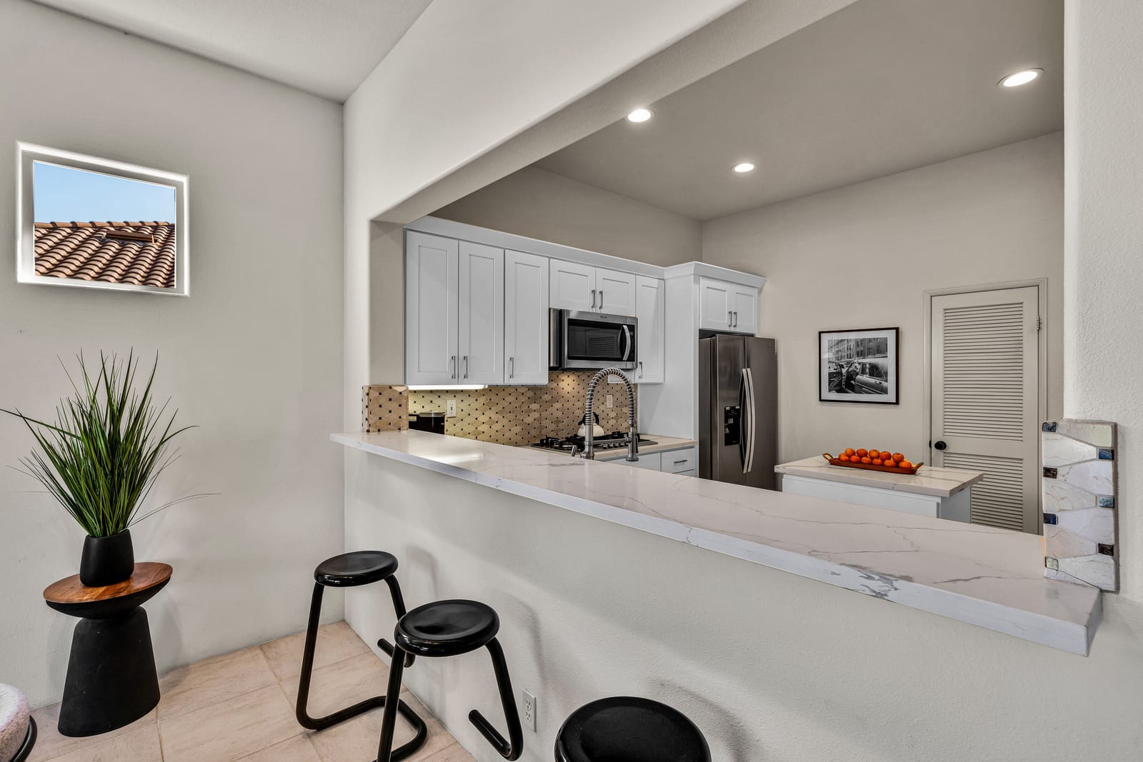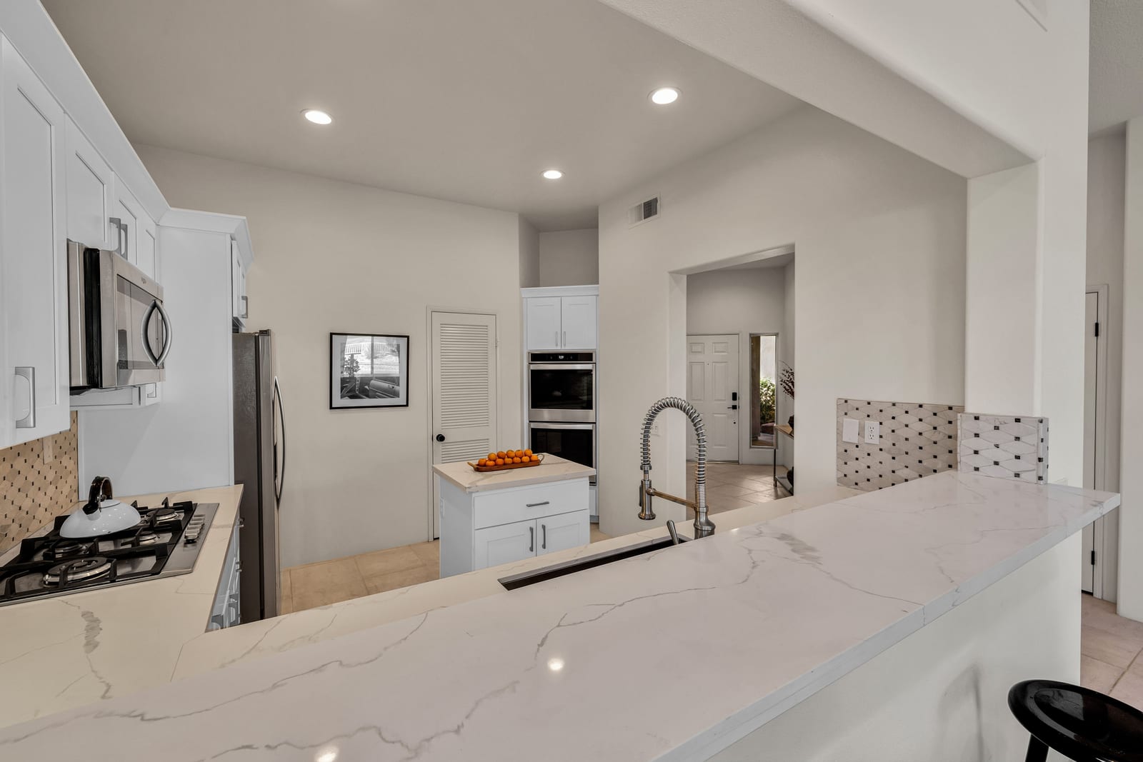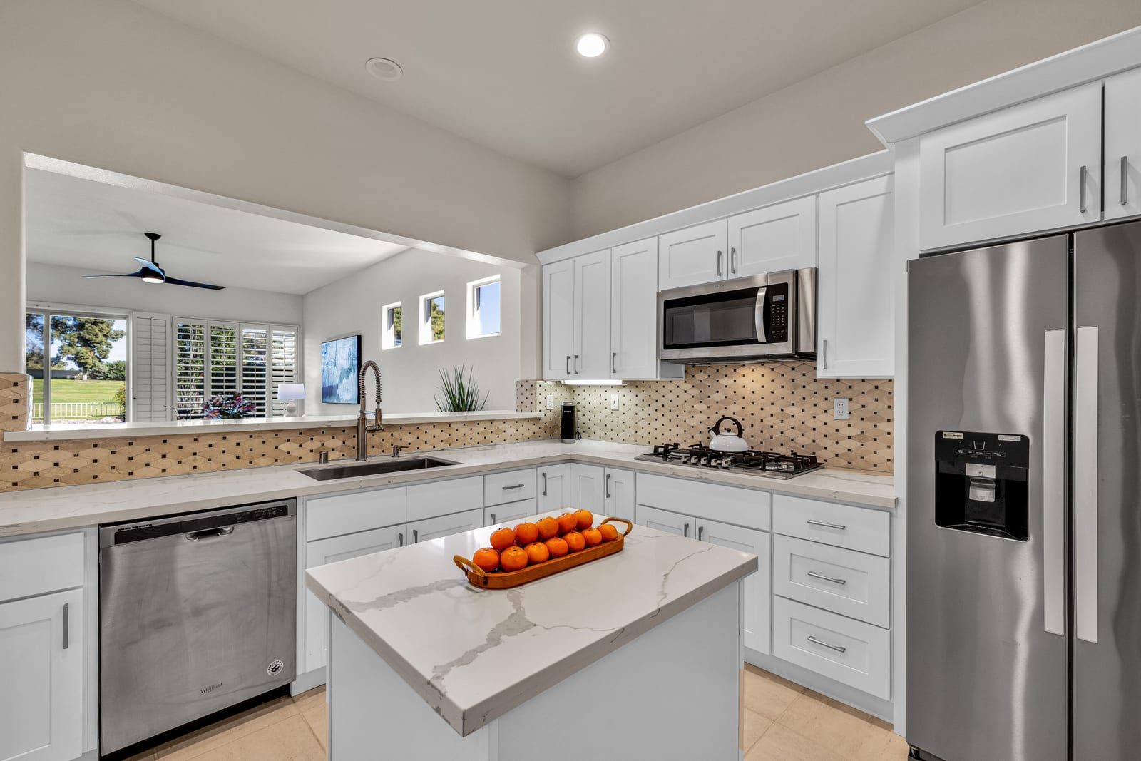 The updated kitchen includes new cabinetry, center island, breakfast bar, and walk-in pantry. The great room features a wet bar and modern slate fireplace, creating a stylish gathering space. The floor plan offers excellent bedroom separation for privacy, while the attached casita with private entrance is perfect for guests, a home office, or studio.