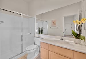HOA amenities include guard-gated security, cable TV, internet, exterior home and roof maintenance, earthquake insurance, front yard landscaping, and beautifully maintained grounds. Residents also enjoy four community pools and spas, bocce court, and access to a private 10-hole golf course with low annual fee.