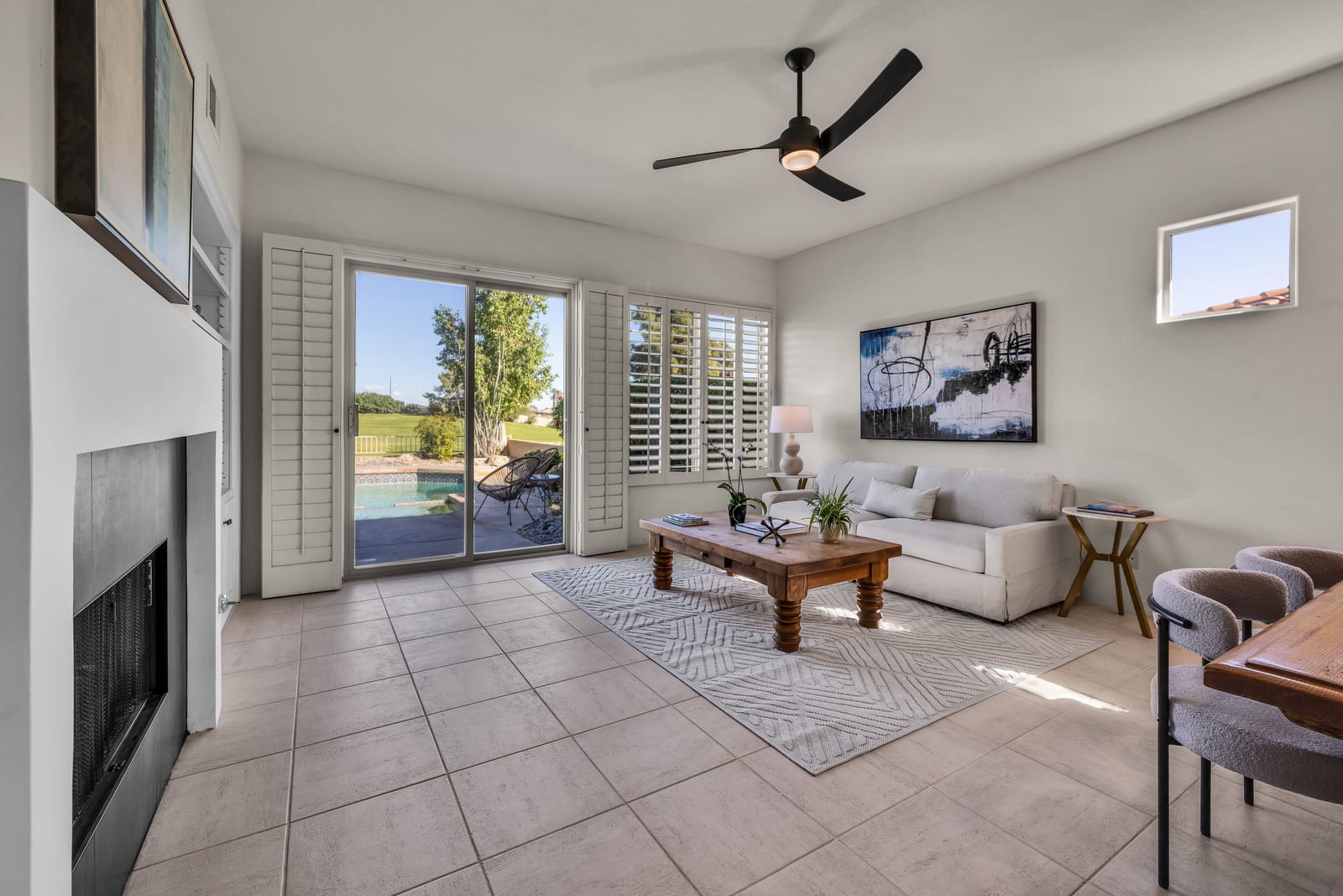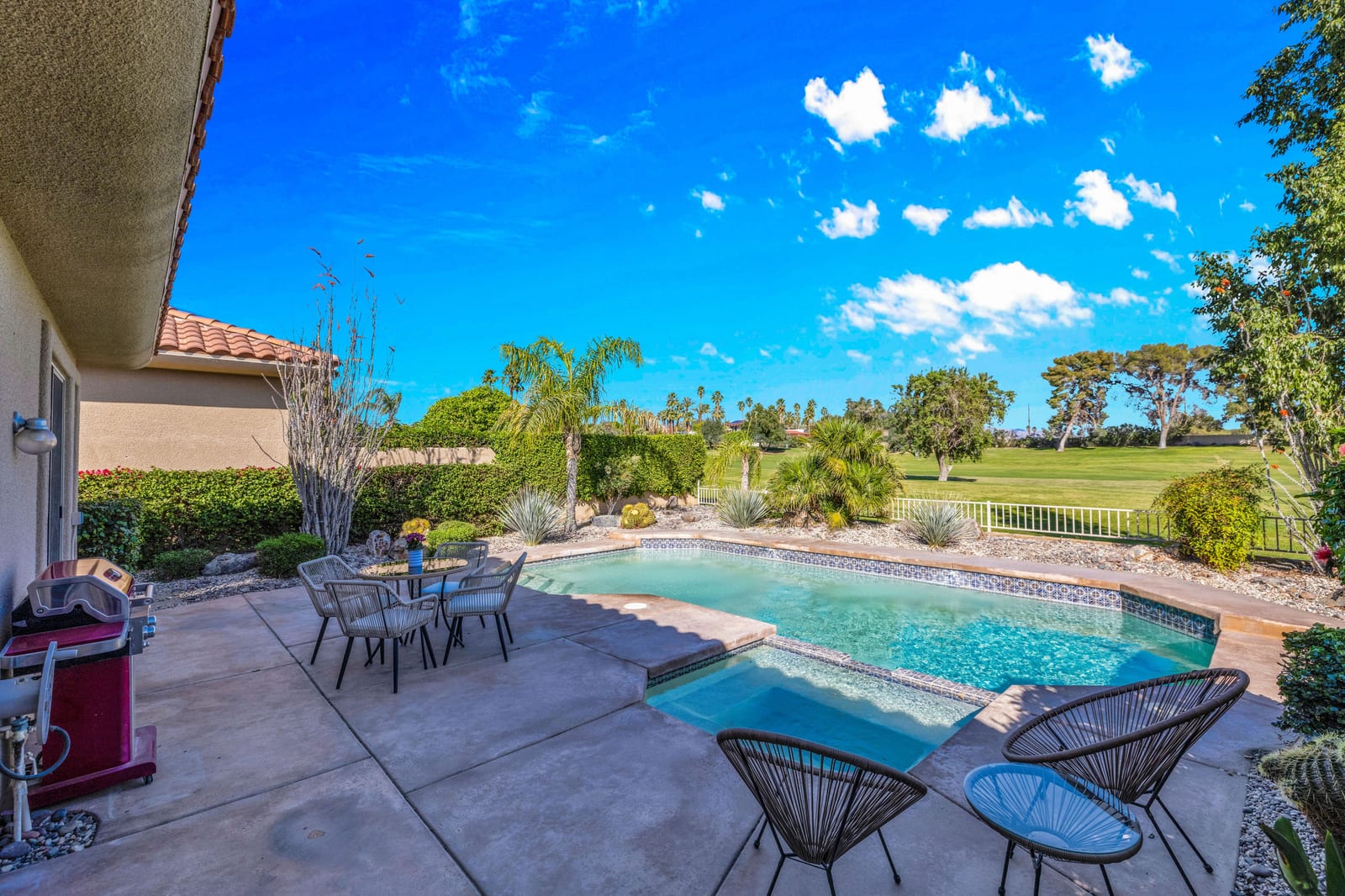 Enjoy the private backyard with sparkling pool and spa—ideal for relaxing or entertaining in the desert sunshine. Additional highlights include a two-car garage plus golf cart parking or extra storage.