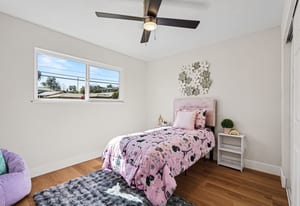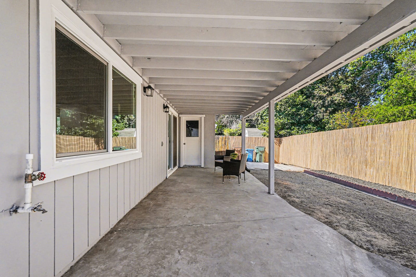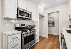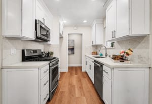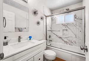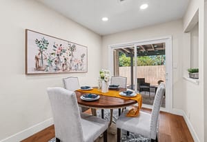 The updated kitchen offers crisp white shaker cabinetry and sleek quartz counters. Adjacent to the kitchen is a cozy dining area with sliding glass door leading to the backyard - perfect for indoor-outdoor living and entertaining.