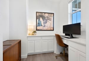 The vaulted main level showcases a dramatic great room anchored by a soaring fireplace, creating an inviting space for both entertaining and everyday living. A chef-inspired gourmet kitchen features a generous center island, double ovens, an oversized pantry, and flows seamlessly into the open dining area. A dedicated tech workspace and a versatile main-level bedroom or office with full bath complete the level.