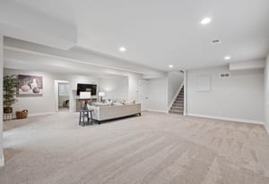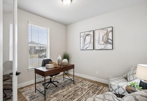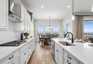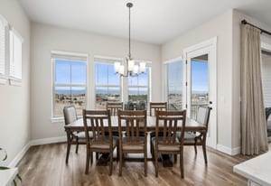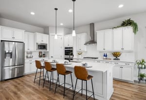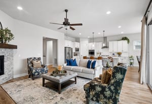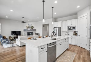 Natural light pours through expansive windows, highlighting luxury vinyl plank flooring, slab quartz countertops, stainless steel appliances, and warm, contemporary lighting. The open-concept great room flows seamlessly into an eat-in kitchen, ideal for everyday living and entertaining.