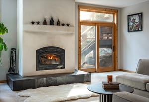 Step inside to a welcoming mudroom entry and into the heart of the home where exposed wood beams, a beautiful plaster wood-burning fireplace, and forest views create a living room that feels both cozy and refined. Natural light fills the space throughout the day thanks to the home’s open setting and expansive windows.