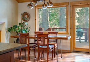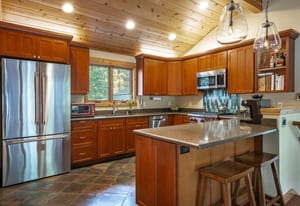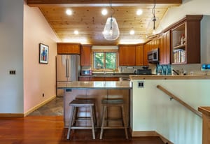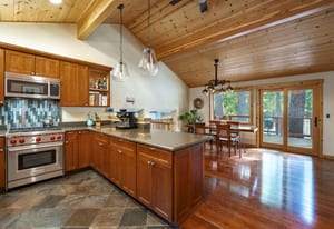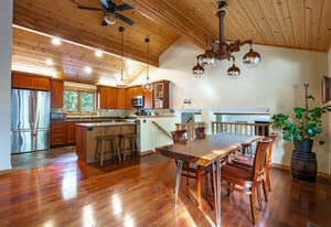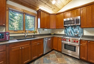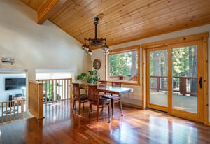 The kitchen and dining area are equally inviting — designed for gathering after a day on the lake or slopes. Rich cherry cabinetry, Silestone counters, a Wolf professional range, and vaulted wood ceilings create a warm, functional space that balances Tahoe charm with quality craftsmanship.