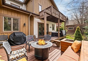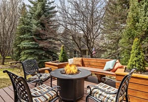 Outdoor spaces are equally compelling. A welcoming front porch captures early morning light, while the back deck offers a more secluded setting, offering a hot tub, fire pit and custom seating. The professionally designed yard evolves beautifully throughout the seasons, often visited by local wildlife, adding to the home's sense of place.