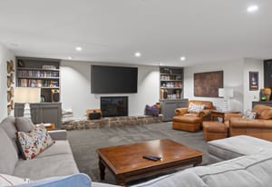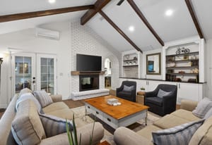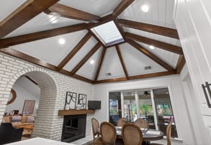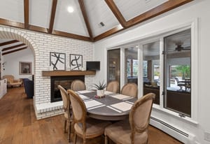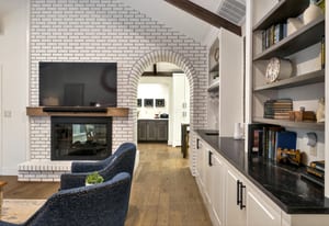 The kitchen opens to an inviting family room with vaulted ceilings, a cozy fireplace, custom built-ins, and large doors that frame views of the backyard. The well-designed floor plan strikes a perfect balance between open-concept living and defined spaces for both entertaining and quiet retreat.