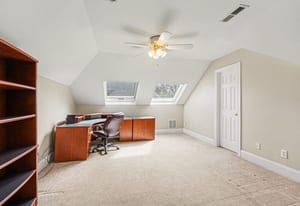 The upstairs layout provides two separate private spaces, each accessed by its own private staircase, offering excellent flexibility. One staircase leads to a bedroom with a full bathroom, while the second staircase leads to a flex room with a half bathroom, well suited for use as a home office, hobby room, workout space, or guest retreat.