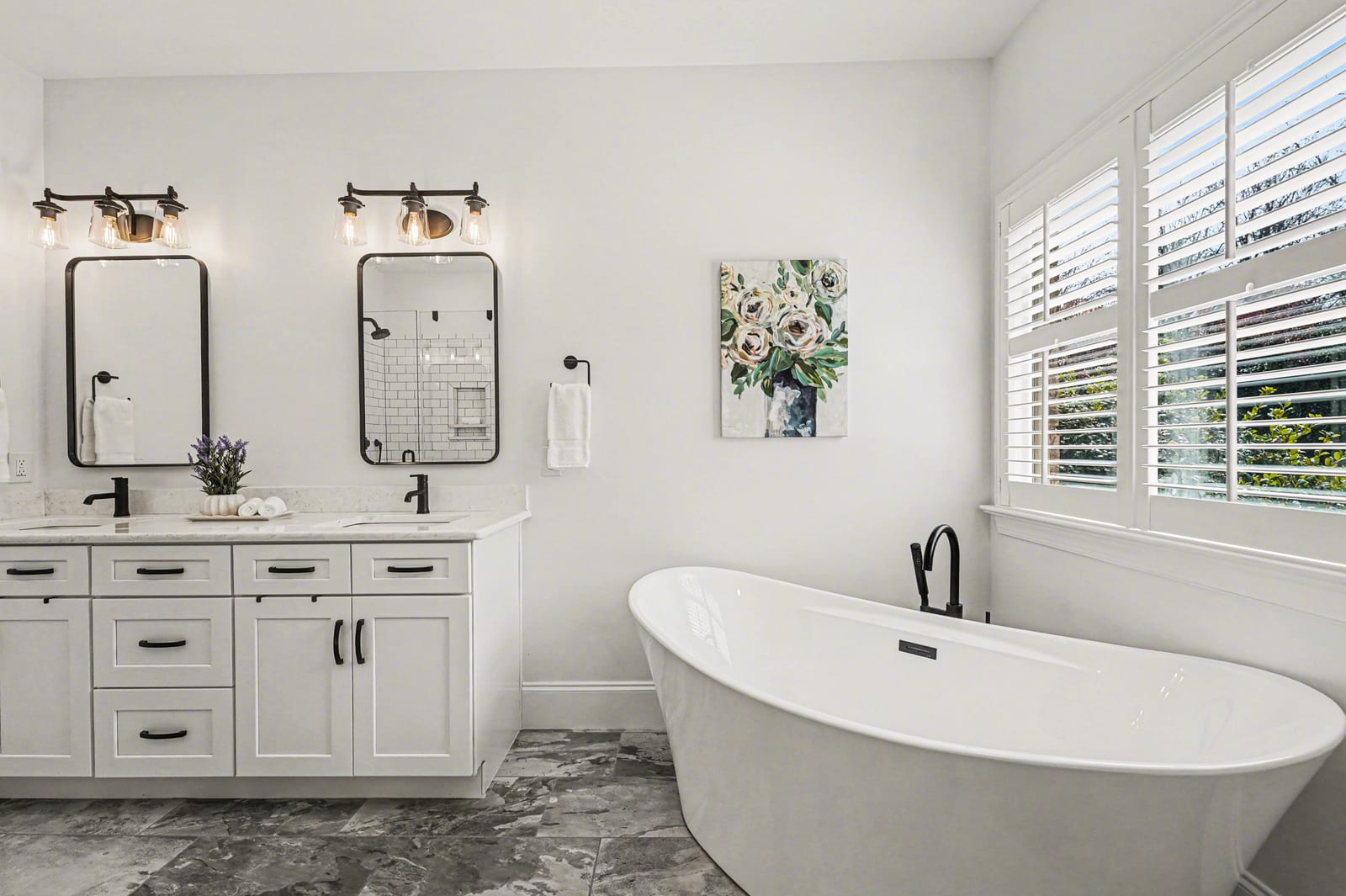 The hall bathroom features dual vanities and an oversized zero-entry tiled shower, creating a sleek and modern design that is both stylish and practical. The zero entry shower offers easy access and thoughtful functionality, making it well suited for multigenerational living, guests, or long-term accessibility needs. The primary bathroom features dual vanities, a spacious tiled shower, and a separate soaking tub, creating a comfortable, relaxing private retreat.
