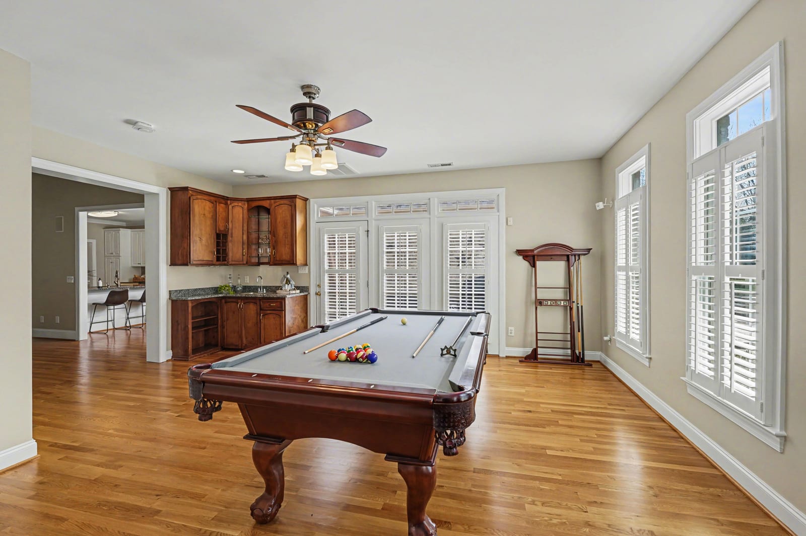 Hardwood floors extend throughout the main living areas, creating a warm and cohesive living environment. At the rear of the home, a large bonus or game room provides additional living space and includes a wet bar, making it an ideal setting for entertaining, recreation, or relaxing with friends and family.