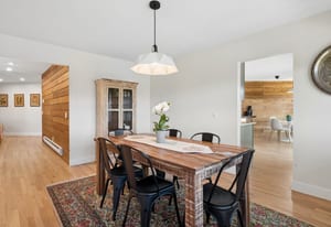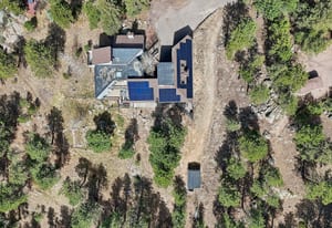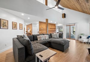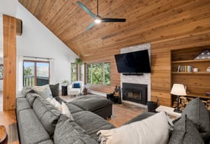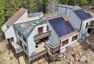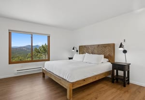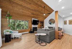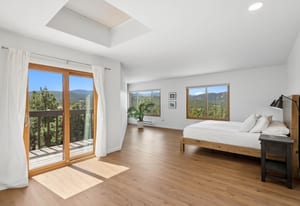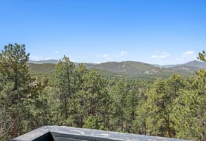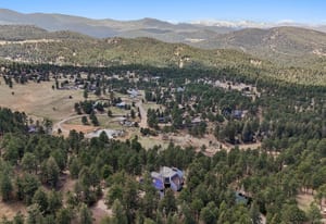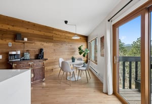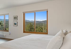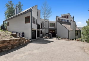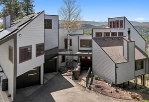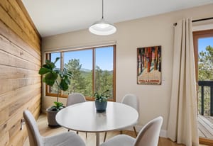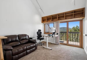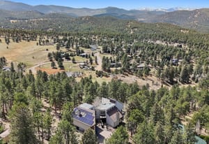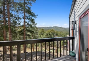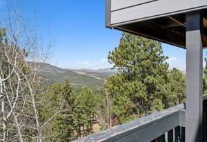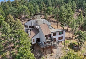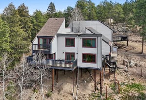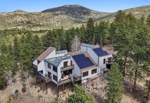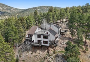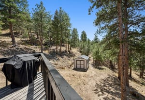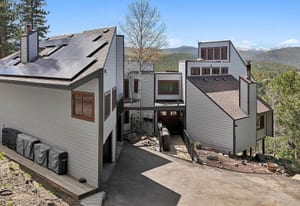 Experience refined mid-century inspired mountain living in this beautifully reimagined residence, privately set on 3.37 acres with sweeping panoramic views and a setting adjacent to open space. Thoughtfully updated while honoring its architectural character, the 3,769 sq ft home seamlessly blends rich natural textures, tongue-and-groove detail, and elevated modern finishes to create a warm yet sophisticated retreat. The designer kitchen serves as the centerpiece of the home, appointed with quartz countertops, an expansive island, stainless steel appliances, a sunlit breakfast nook, and fresh interior paint, all flowing effortlessly to multiple decks that invite indoor-outdoor living. The formal dining room is framed by breathtaking vistas, offering an unforgettable setting for elevated entertaining. The primary suite is a true sanctuary, featuring a spa-inspired en suite with stone surfaces, custom cabinetry, lighted mirrors, an oversized walk-in shower, and a spacious walk-in closet. A secondary bedroom and bath on the main level provide convenience for guests, while the upper-level loft offers a flexible space ideal for a private office or studio. Outdoor living is exceptional, with six distinct decks designed to capture the surrounding landscape and ever-changing mountain views. A separate lock-off studio with private entrance offers versatile use, complete with a kitchenette, lofted sleeping area with walk-in closet, living and dining space, and a ¾ bath—perfect for extended stays, creative pursuits, or private guest accommodations. Extensive upgrades include triple-pane windows, durable Hardie board siding, and thoughtfully integrated built-ins throughout. The property is further enhanced by a 3-car attached garage, generous off-street parking, and a rare combination of privacy and accessibility just minutes from the heart of Evergreen and Evergreen Lake.