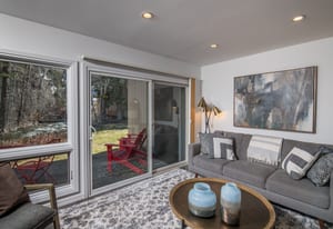 The living area is anchored by a fireplace and framed by the sights and sounds of the creek, with access to fly-fishing along the community creekside setting. The primary suite enjoys its own peaceful creekside outlook.
