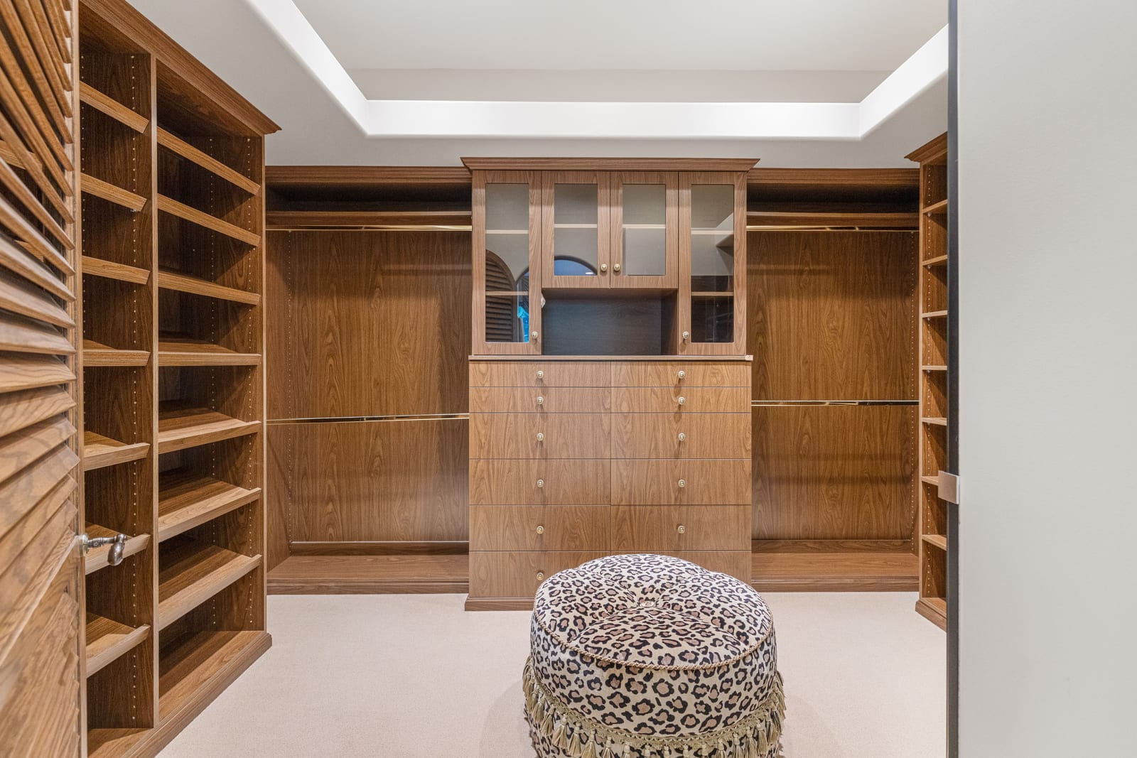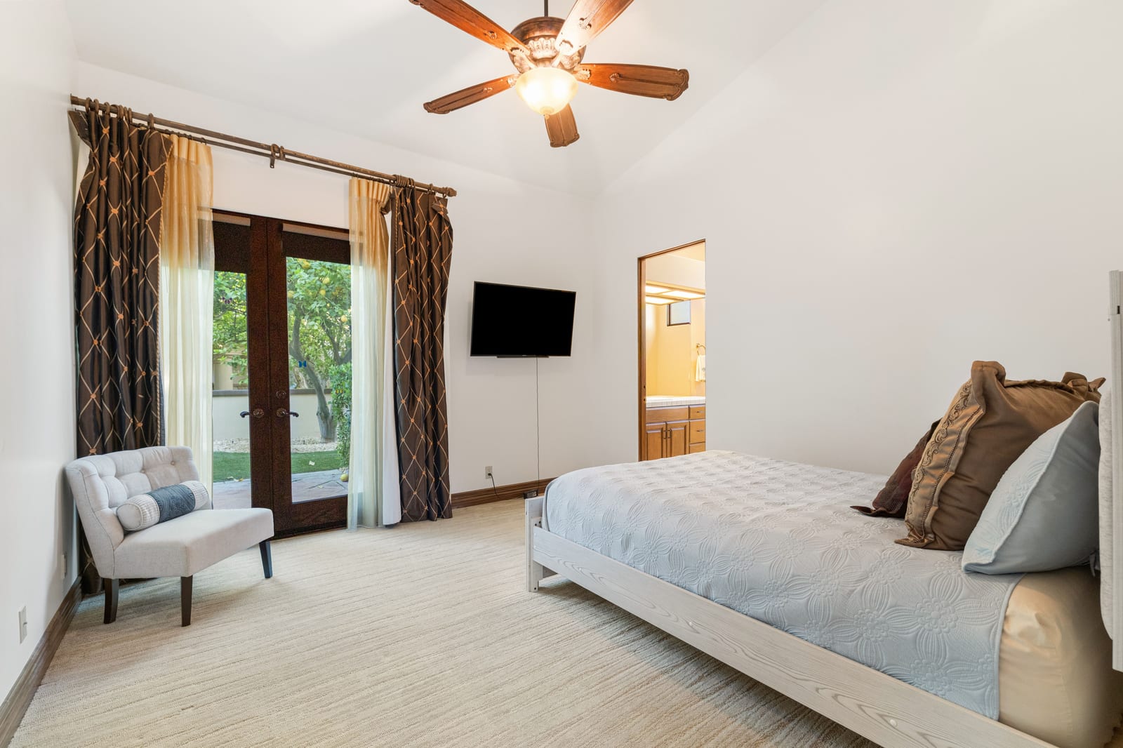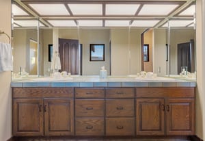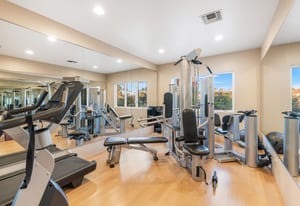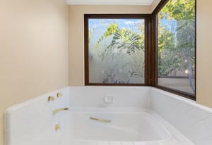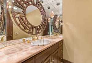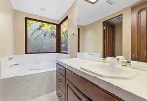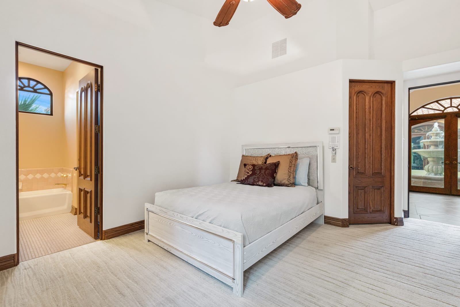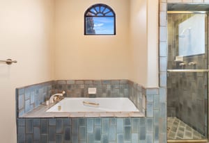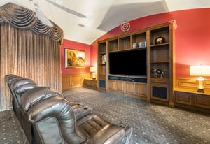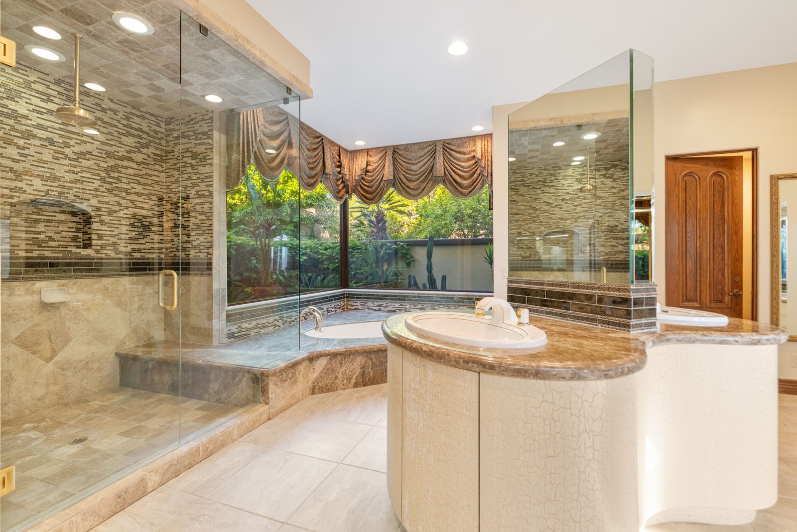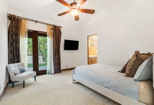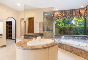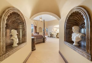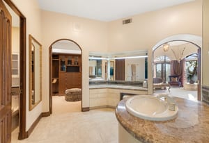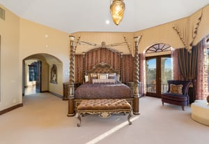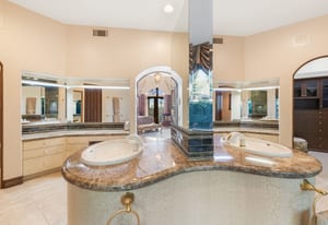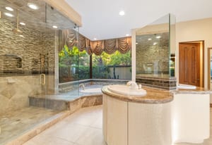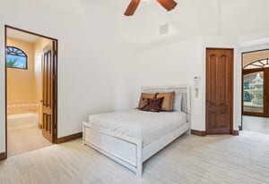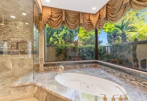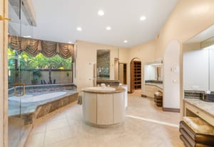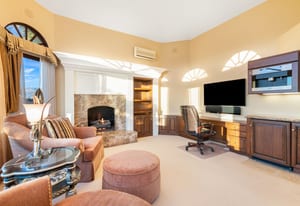 The luxurious primary suite is a private retreat offering exceptional scale and comfort. The spa-inspired primary bath features a marble soaking tub, dual island-style vanities, an oversized walk-in shower, and two spacious walk-in closets. This suite also includes a versatile private room with fireplace, ideal for a home office, media lounge, or quiet sitting room.