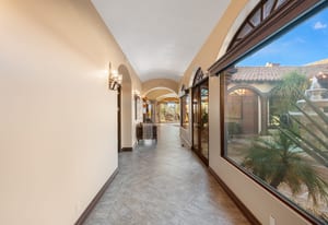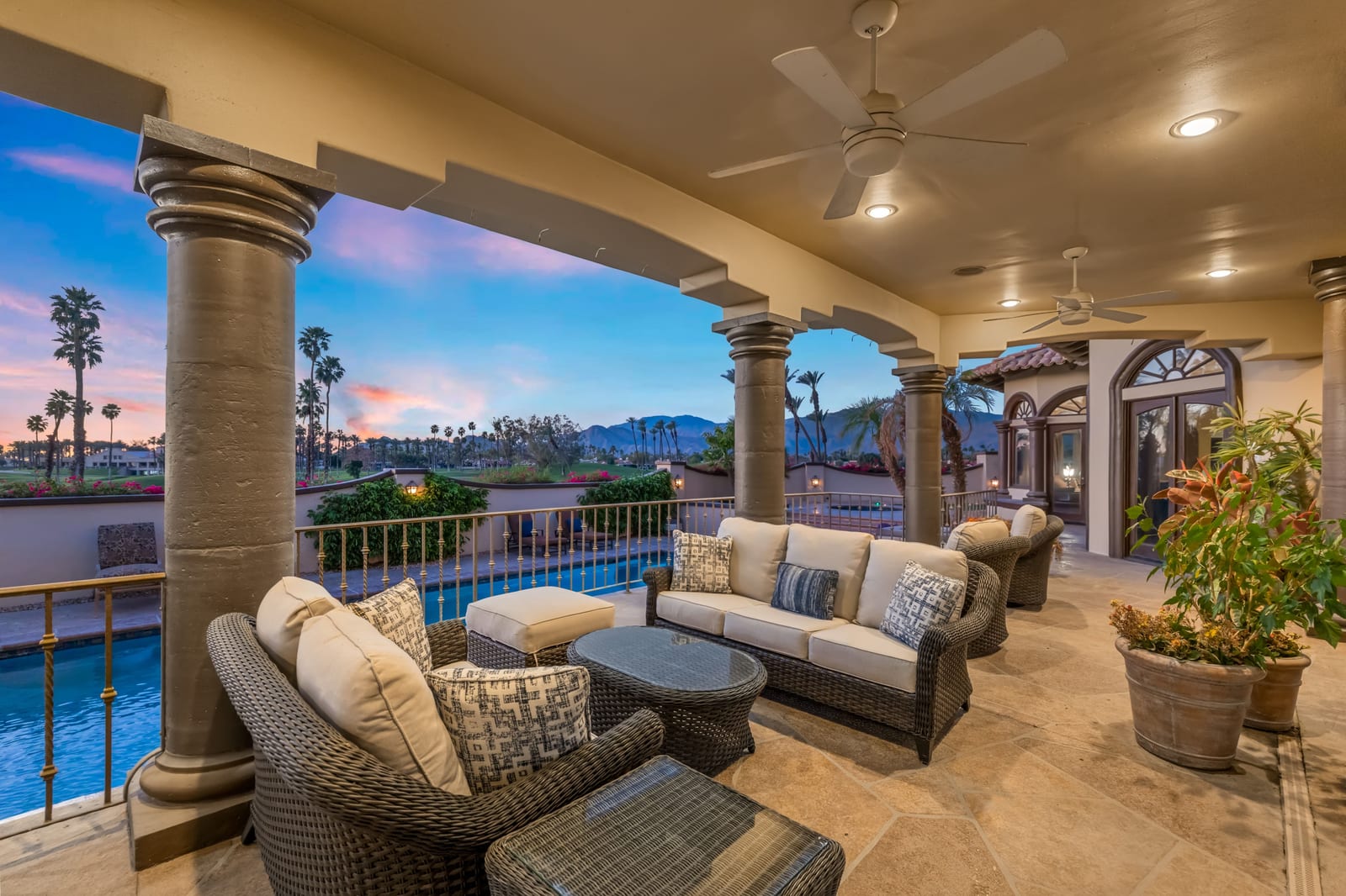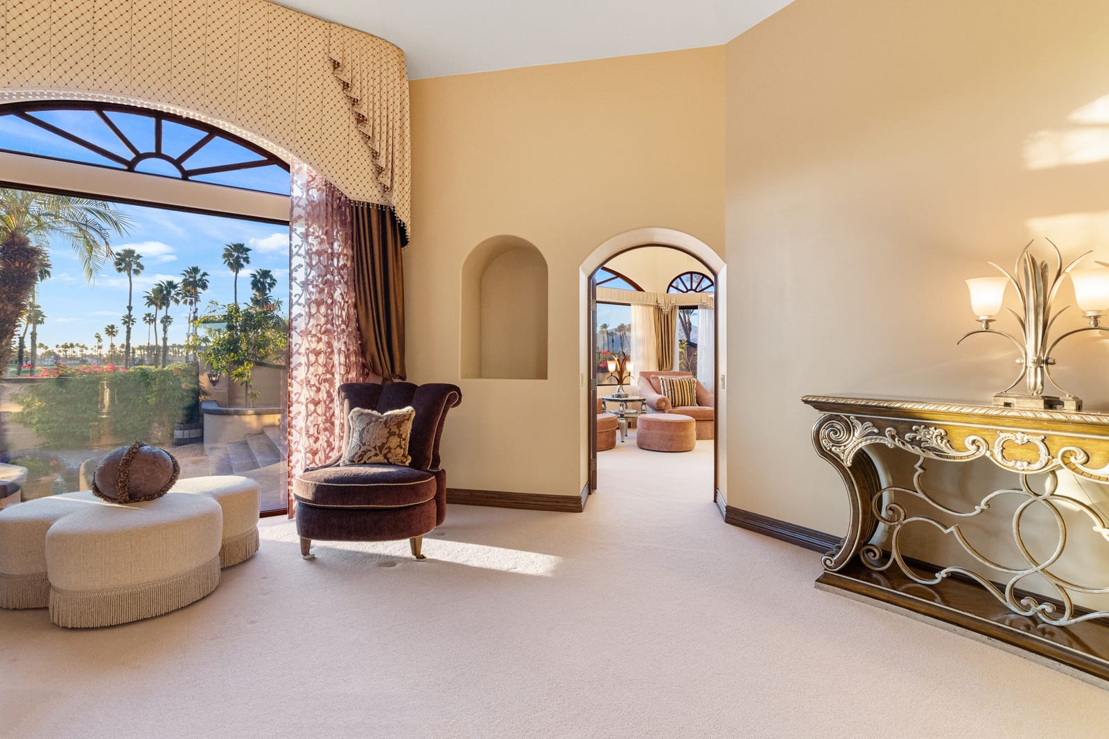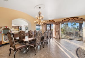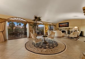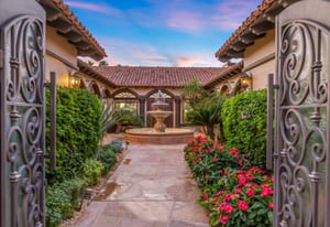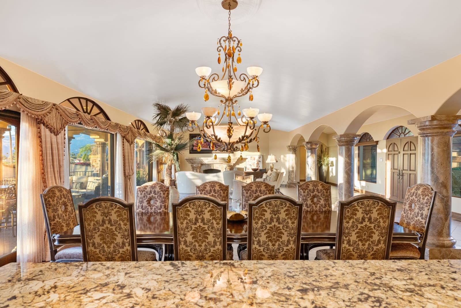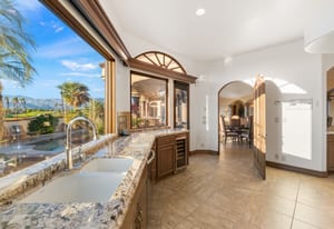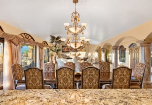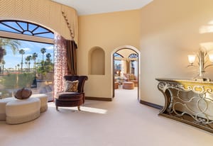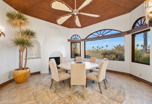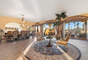 Arrival begins through a private gated courtyard highlighted by a dramatic fountain that creates an elegant and tranquil first impression. Inside, the home opens to a grand great room with expansive living spaces, featuring a formal living area with fireplace and a spacious dining room designed to comfortably accommodate gatherings of ten or more guests. Walls of glass frame sweeping views of the pool, golf course, and the dramatic mountain backdrop, filling the home with natural light and creating a truly unforgettable setting.