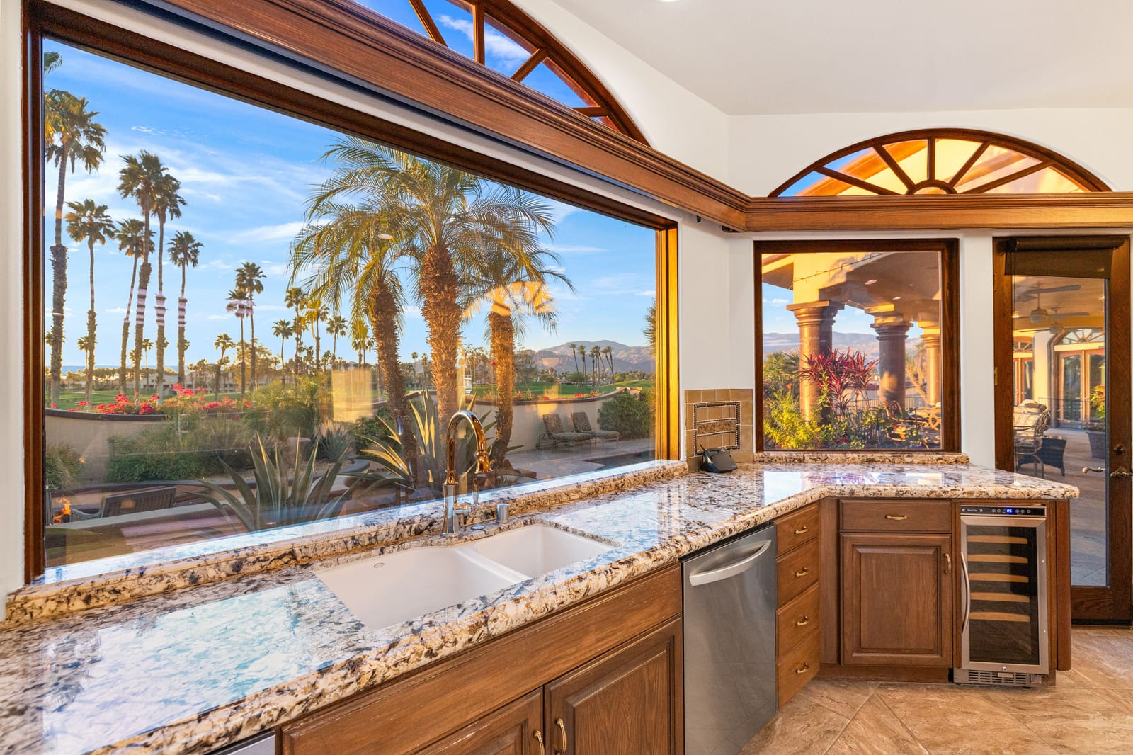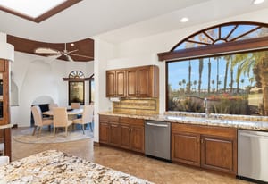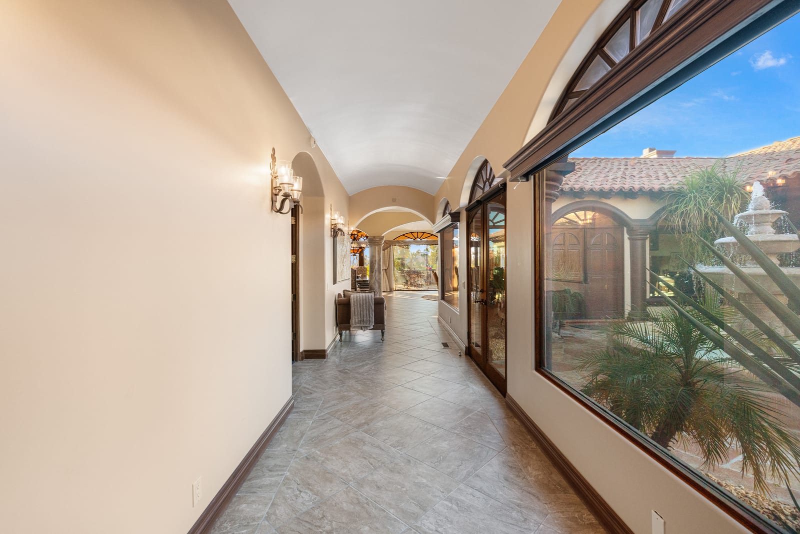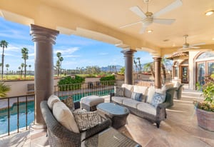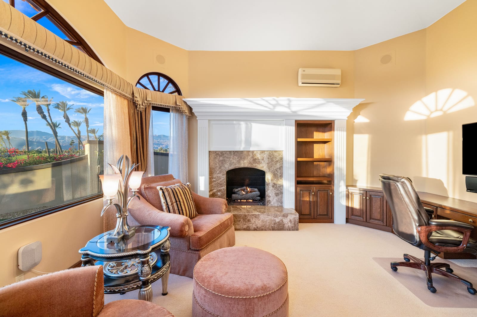 Arrival begins through a private gated courtyard highlighted by a dramatic fountain that creates an elegant and tranquil first impression. Inside, the home opens to a grand great room with expansive living spaces, featuring a formal living area with fireplace and a spacious dining room designed to comfortably accommodate gatherings of ten or more guests. Walls of glass frame sweeping views of the pool, golf course, and the dramatic mountain backdrop, filling the home with natural light and creating a truly unforgettable setting.