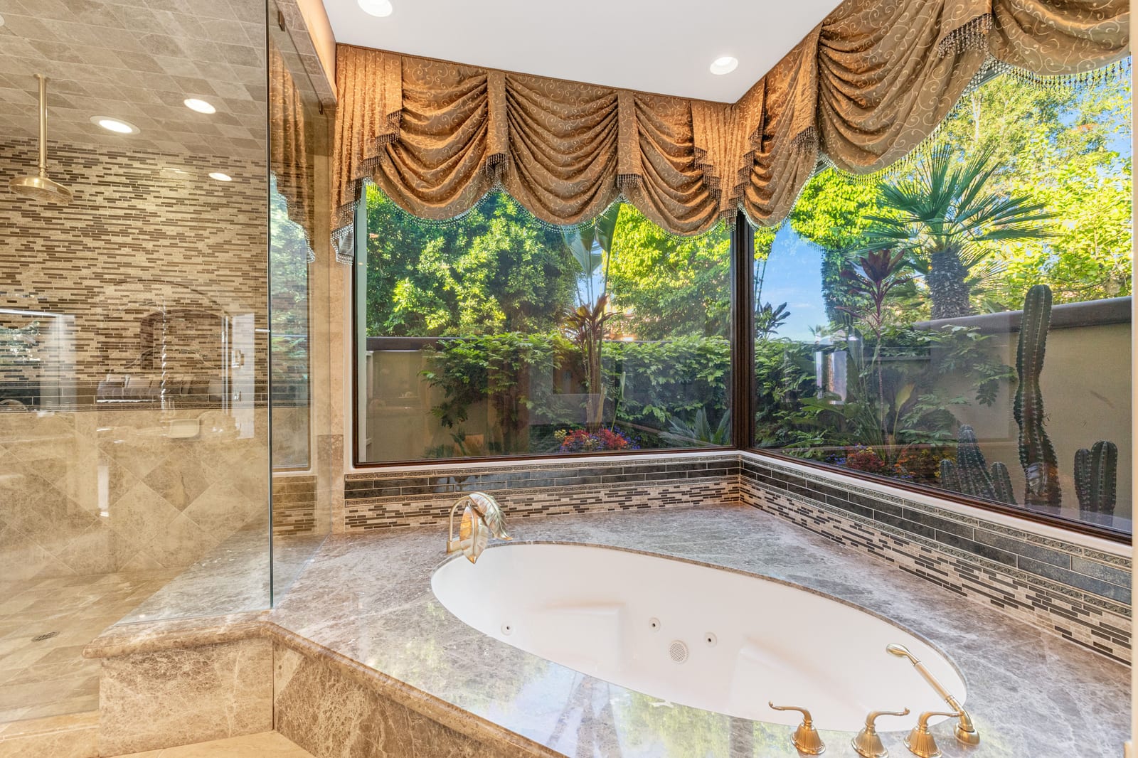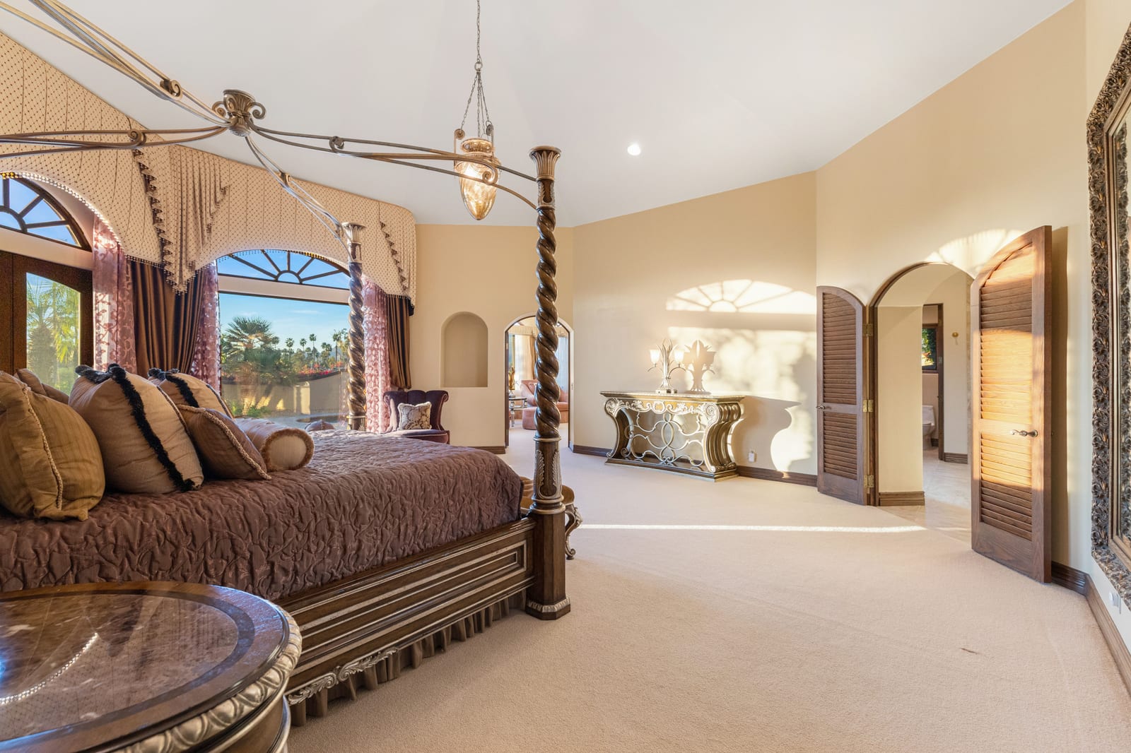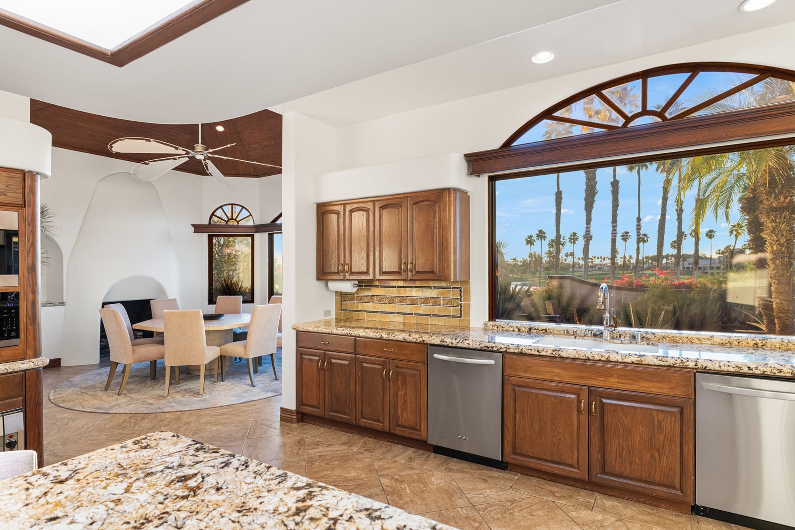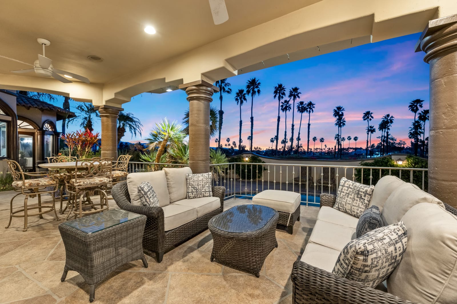 Arrival begins through a private gated courtyard highlighted by a dramatic fountain that creates an elegant and tranquil first impression. Inside, the home opens to a grand great room with expansive living spaces, featuring a formal living area with fireplace and a spacious dining room designed to comfortably accommodate gatherings of ten or more guests. Walls of glass frame sweeping views of the pool, golf course, and the dramatic mountain backdrop, filling the home with natural light and creating a truly unforgettable setting.