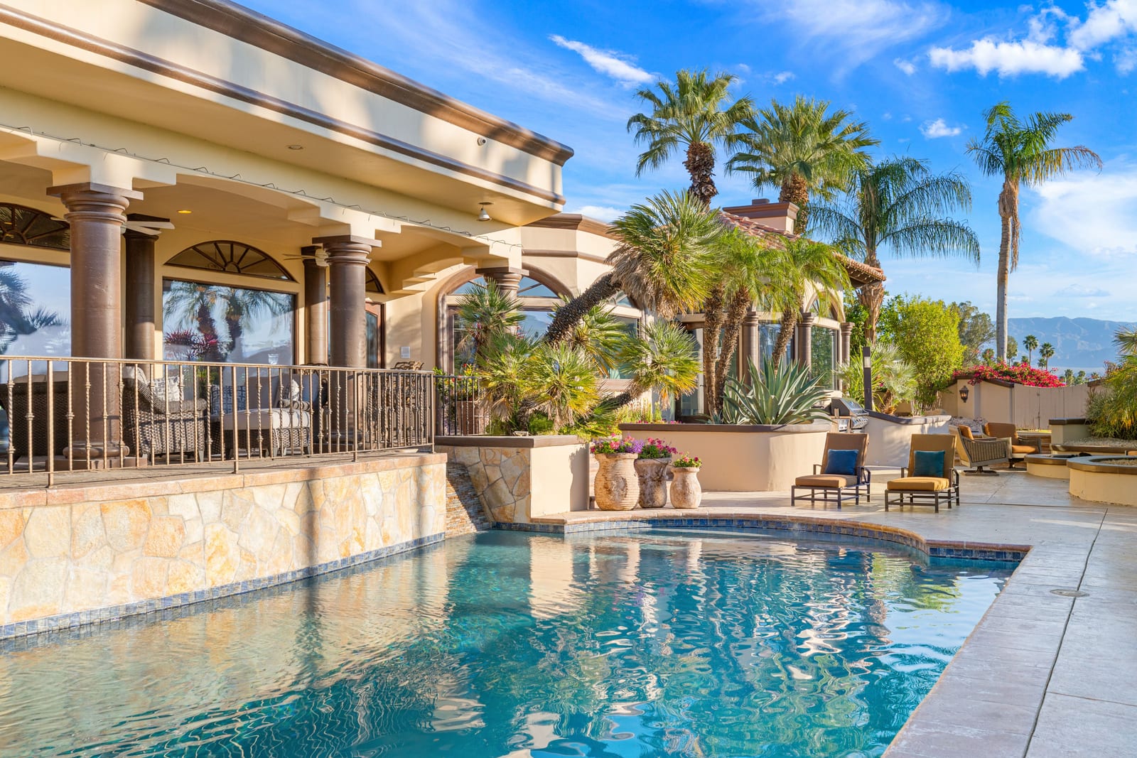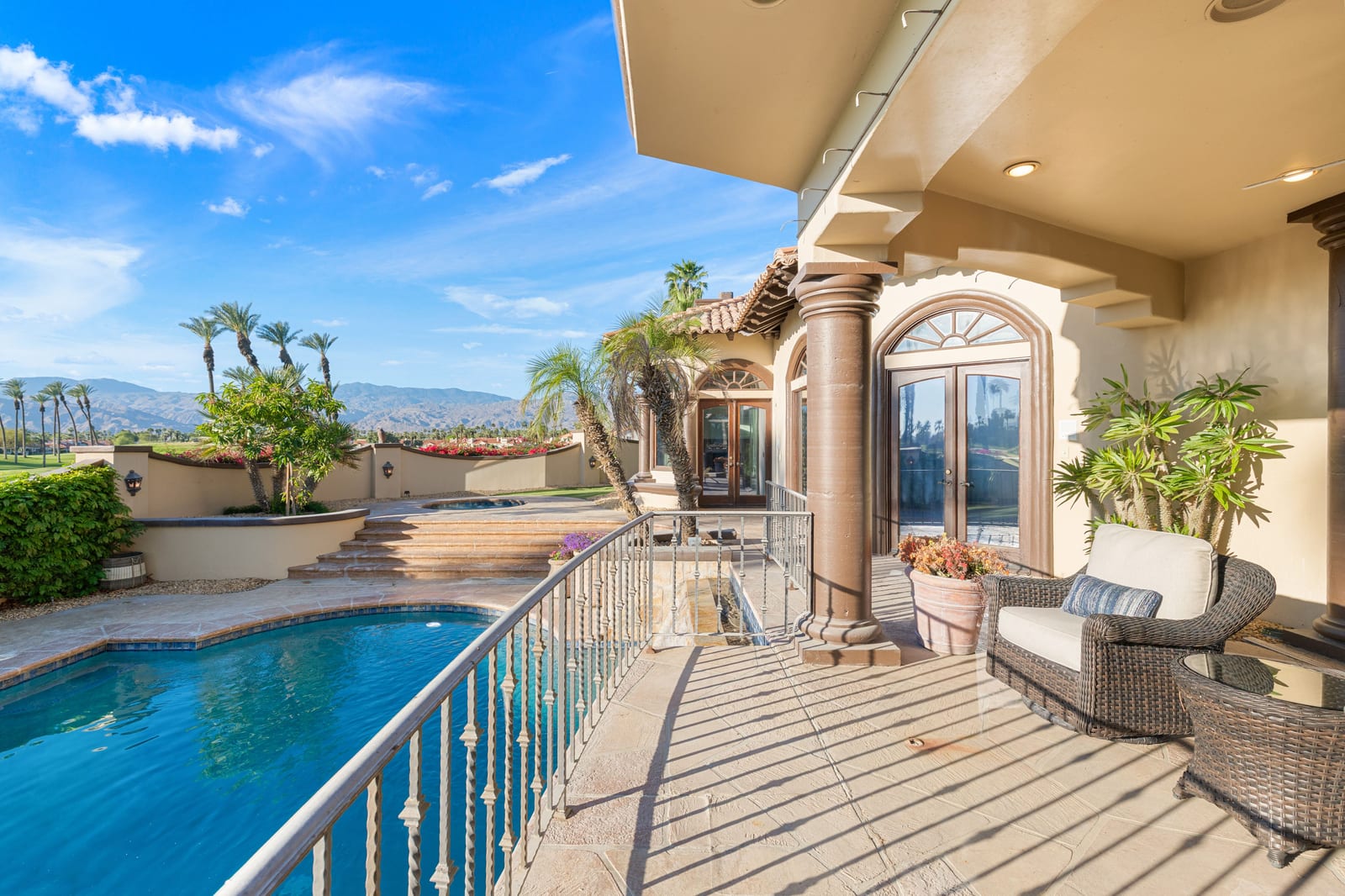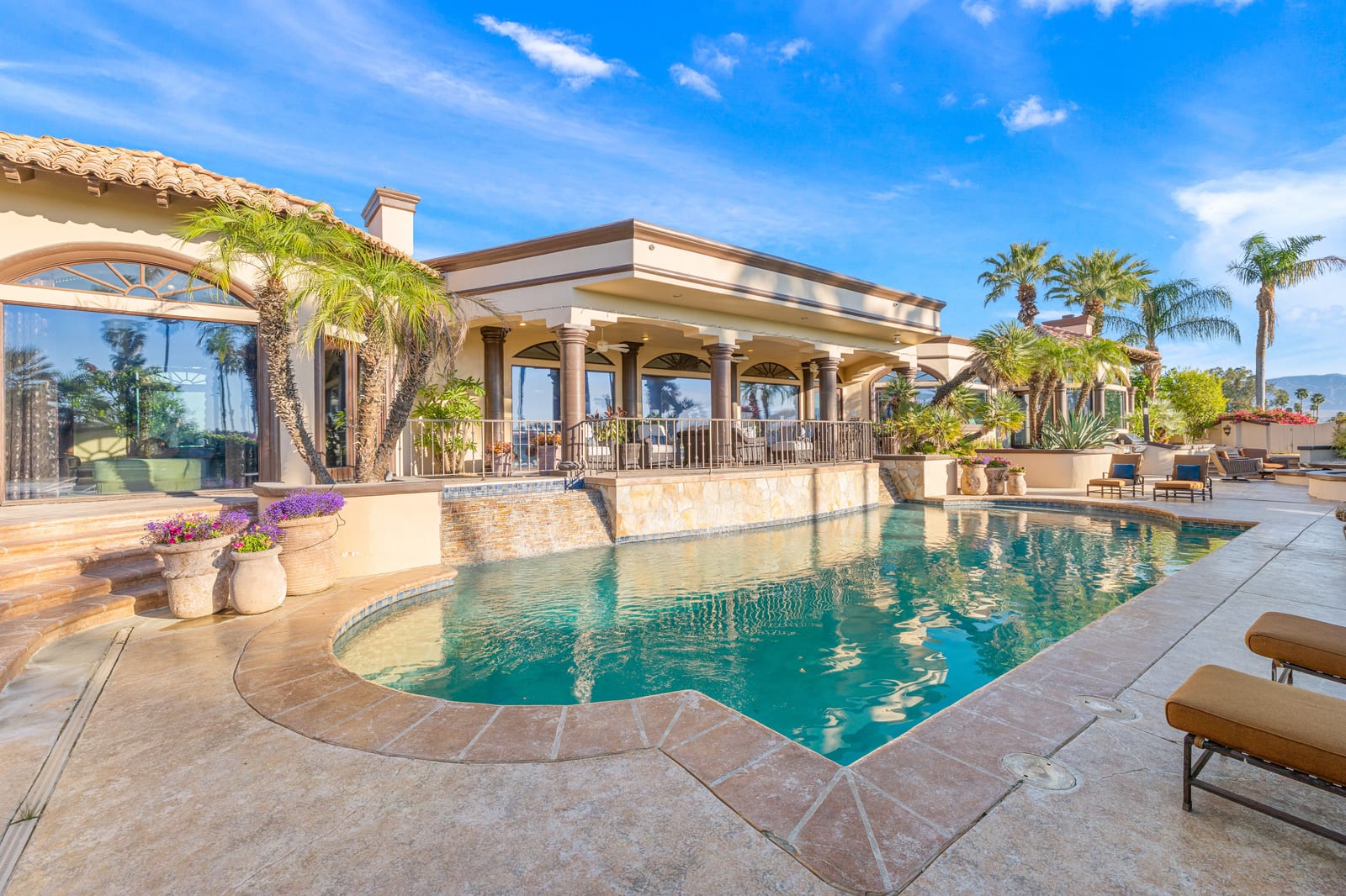 Offering breathtaking panoramic mountain and golf course views, this remarkable 7,185 square foot custom estate is the most distinctive residence in Desert Falls Estates. Originally constructed by the developer of Desert Falls Country Club as his personal residence, the home was thoughtfully designed to capture the beauty of the surrounding views while offering exceptional scale, privacy, and luxury.