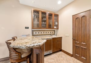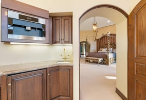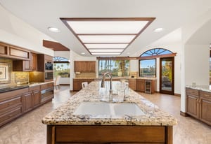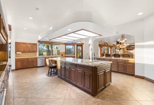 The expansive chef's kitchen is designed for both everyday living and large-scale entertaining. A generous breakfast island serves as the centerpiece, offering stunning views while providing abundant preparation space. The kitchen also includes a charming breakfast area with its own fireplace--perfect for relaxed mornings while enjoying the surrounding scenery and pool area.