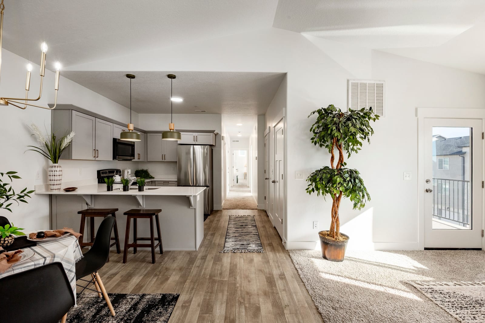 This stunning 2023-built top-level condo delivers modern design with upgraded lighting, vaulted ceilings, and a bright open-concept layout that feels anything but ordinary. Quartz counters, stainless appliances, and a private patio make everyday living feel elevated. Three bedrooms, two baths, a large laundry room, and a private garage complete the package. Community amenities include a pool, clubhouse, gym, and pickleball courts. Minutes from Mountain View Village and quick access to Mountain View Corridor and Bangerter Highway. Lock-and-leave luxury at its best.