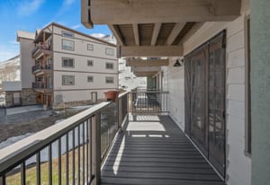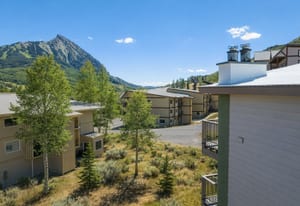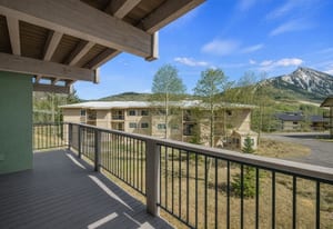 A wood-burning fireplace anchors the main living area, providing a cozy ambiance after a day on the slopes or the surrounding trail network. The large private balcony looks out to surrounding mountain landscapes, including a direct sightline to Mt. Crested Butte.