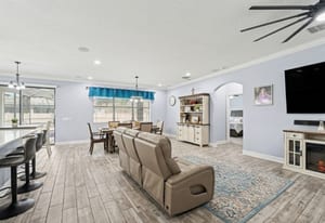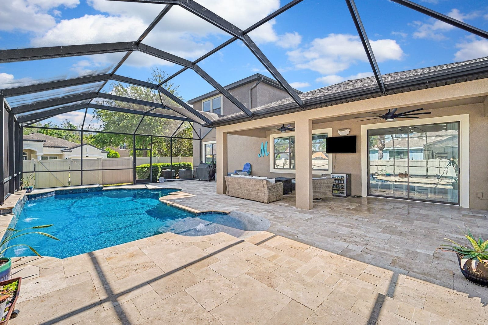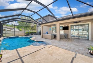 Then comes the surprise! Upstairs, a true bonus suite delivers versatility in a way few homes can—featuring a large media room with projection system, wet bar with wine refrigerator, full bath, and an additional bedroom. Whether it’s a guest retreat, multigenerational setup, or the ultimate game-day destination, this space adapts to your lifestyle. Step outside and the value becomes undeniable. A custom pool and expanded lanai create your own private outdoor escape—complete with covered space, lighting, and room to relax or entertain year-round. In today’s market, this is a major advantage—skip the cost, delays, and disruption of building a pool from scratch and start enjoying it immediately.