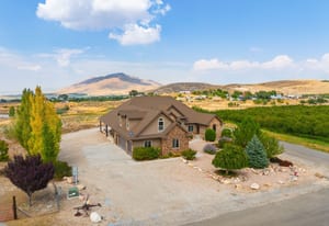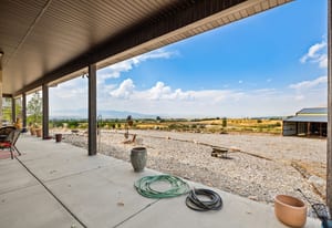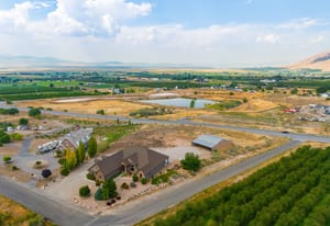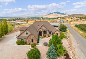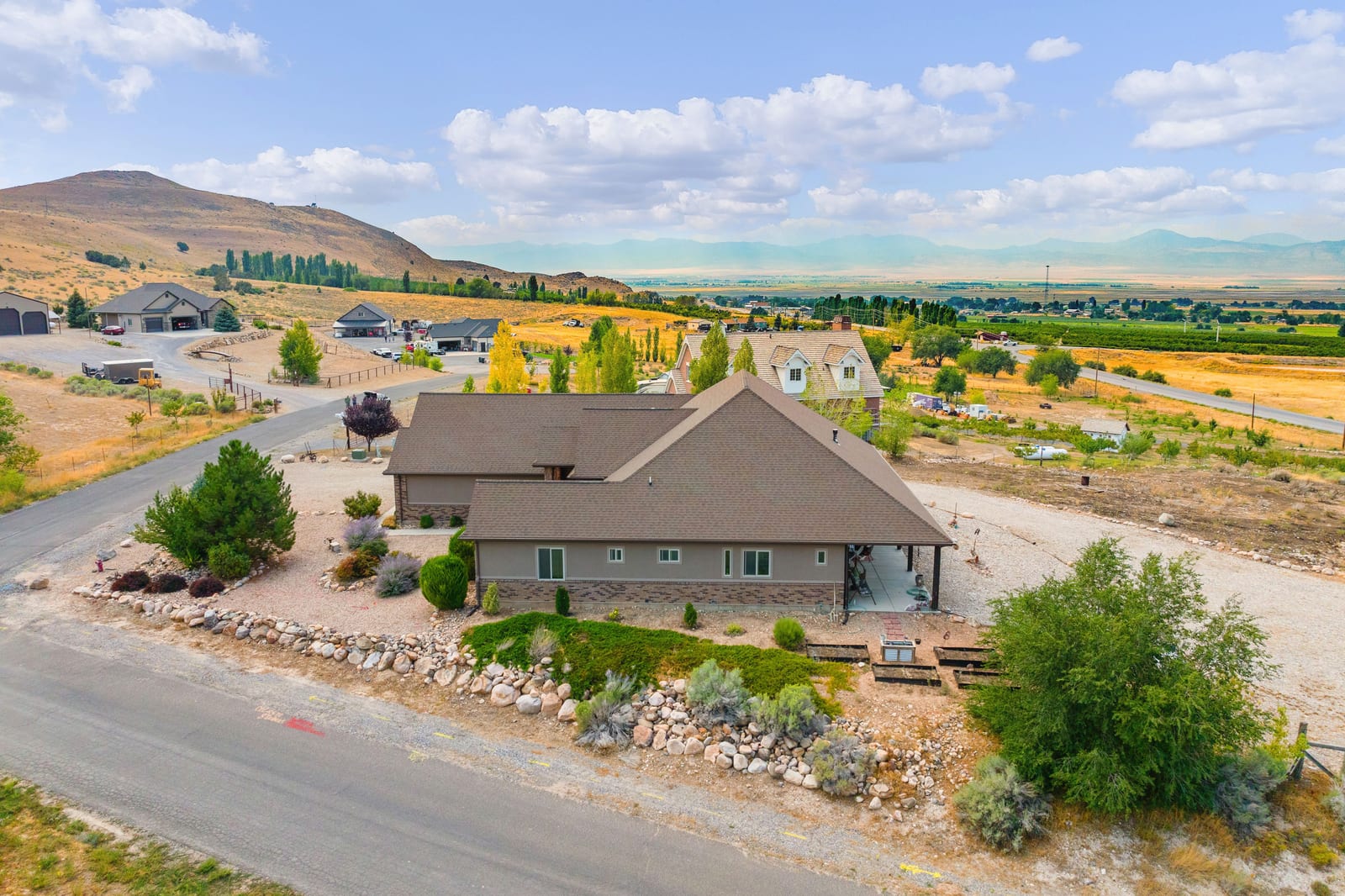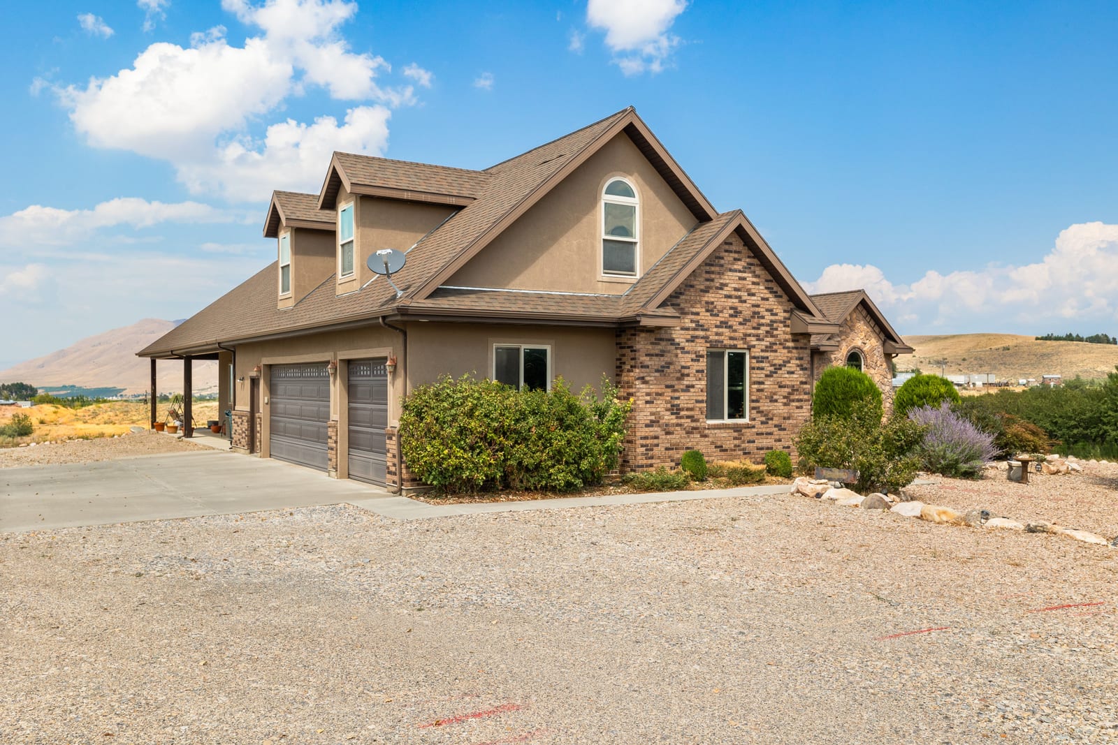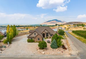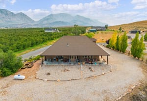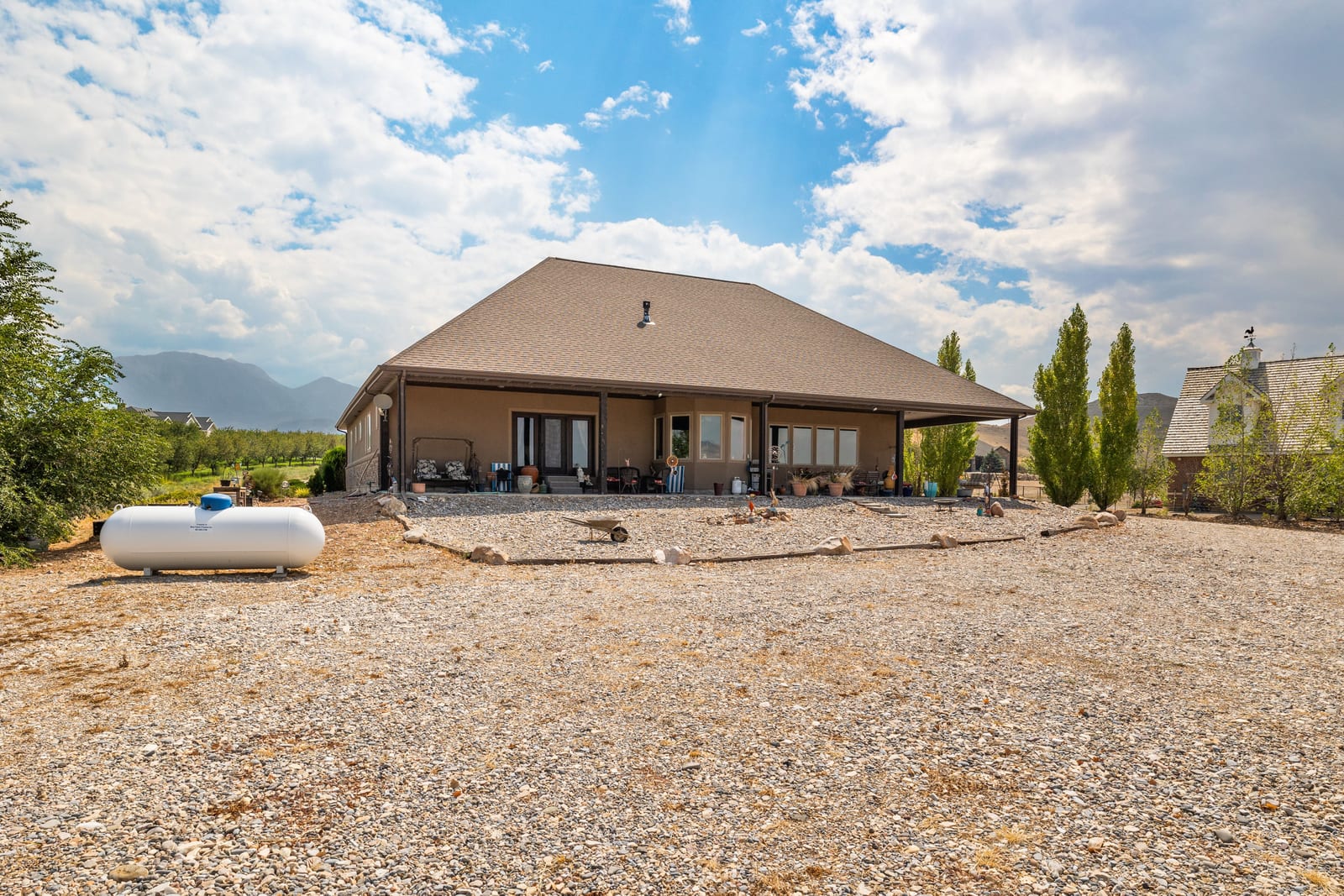 Welcome to this stunning custom Santa Fe–style estate on 2.5 acres in Genola, offering breathtaking valley views and true country living with modern comfort. Designed with both functionality and charm, this property is ideal for horse enthusiasts and those seeking space to live, work, and play. The 48'x64' metal barn is fully equipped with water and power, making it a perfect fit for housing animals or recreational toys. Inside, soaring ceilings reach 14 feet in the entry and office, with 9-foot ceilings throughout the rest of the home. The open-concept floor plan flows seamlessly into a spacious kitchen featuring double-thick granite countertops, custom tile backsplash, an oversized island, and a remarkable 5'x17' walk-in pantry complete with counters and outlets for small appliances. Cozy reading and art rooms adjoin the main living space, anchored by a custom Santa Fe–style fireplace with a pellet stove that can serve as an additional heat source. The extra-large primary suite offers custom granite and tile finishes as well as a generous walk-in closet. A private casita with its own entry, kitchenette, three-quarter bath, and laundry hookups provides a comfortable mother-in-law or guest suite. Upstairs, a nearly 700-square-foot bonus room with two large storage closets and its own half bath provides flexible space for work, play, or entertaining. The oversized 28'x40' garage is fully finished and features a deep sink, storage closet, and a mudroom with adjoining half bath. Beautiful flooring throughout the home includes hardwood, tile, marble, and carpet, all complementing the custom details. Expansive wraparound covered patios measuring 14'x74' creates the perfect space for entertaining while enjoying the mountain and valley views. If country living with modern convenience is what you love, this beautifully designed custom home is truly one of a kind. Square footage figures are provided as a courtesy estimate only and were obtained from an appraisal sketch. Buyer is advised to obtain an independent measurement.